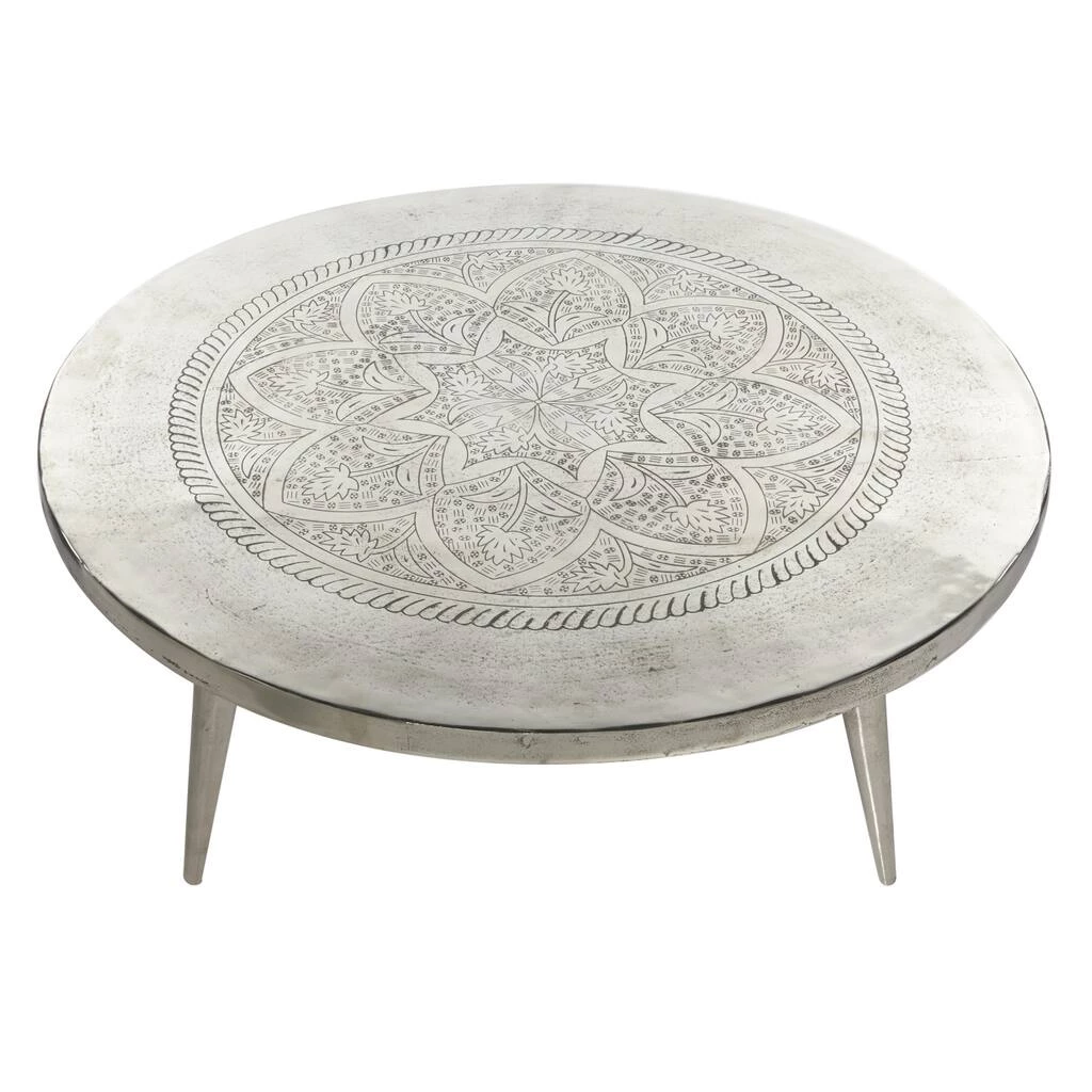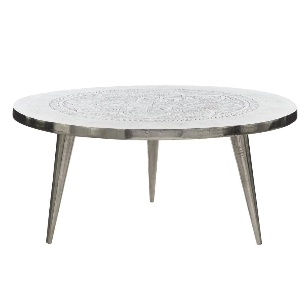 This traditional style inspired silver aluminum round coffee table features a large elaborate flower design on the surface with a round design and 4 round legs. Useful and elegant, coffee tables are more than just a pretty piece of furniture in front of your couch. Sit back, relax, but don’t put your feet up on this coffee table.