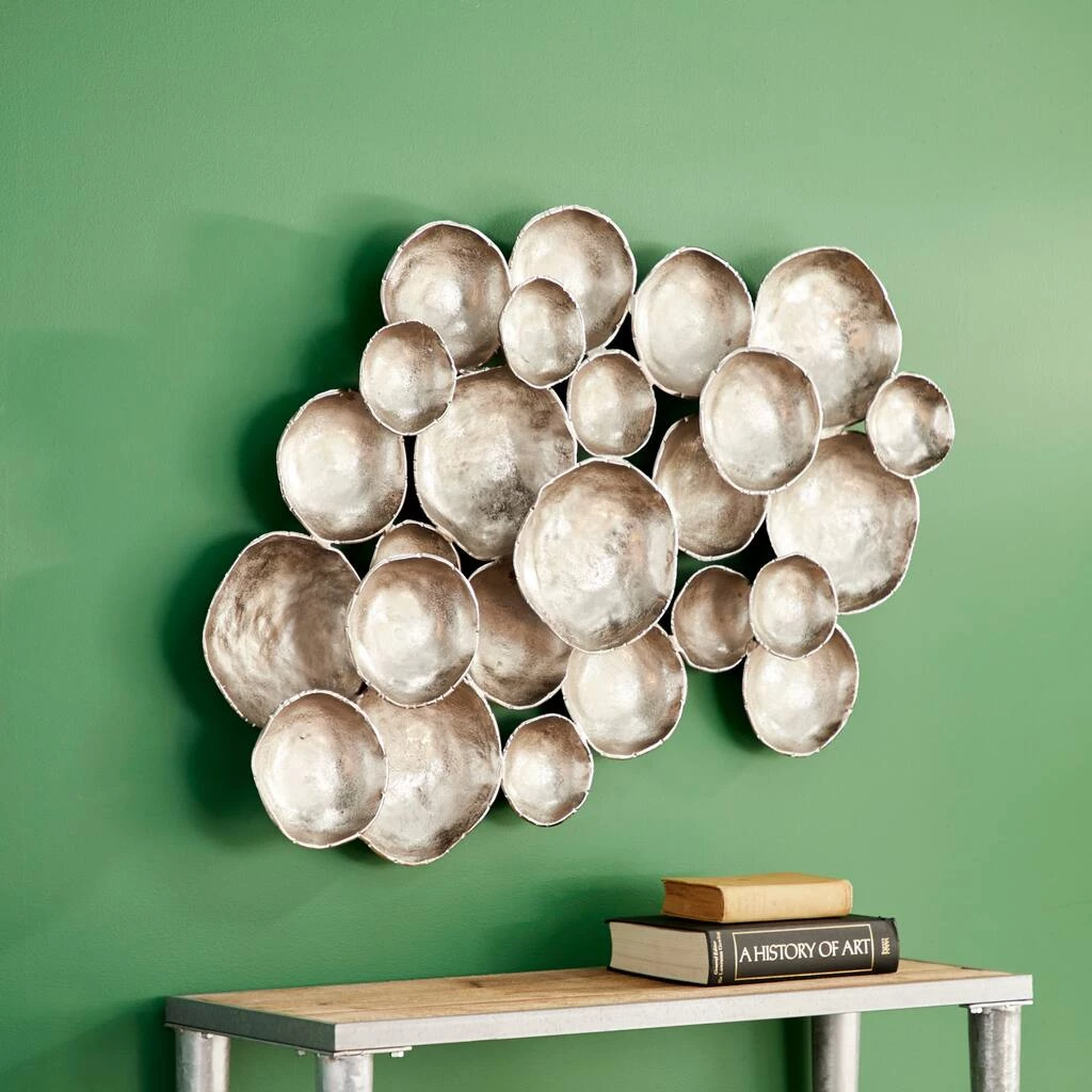 A collection of round, silver pieces come together to form this abstract wall art. Each piece features a striking metallic texture and solid construction. This metal dΓ©cor can make a perfect addition to any contemporary living space, whether you add it to your living room or above your bed. Made in India, the decor is aluminum and easy to hang thanks to its wall mounting hardware. Comes with wall mounting features for easy placement.