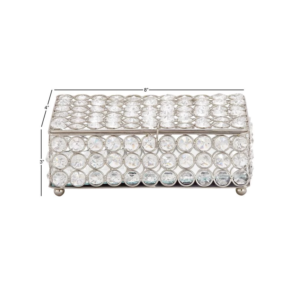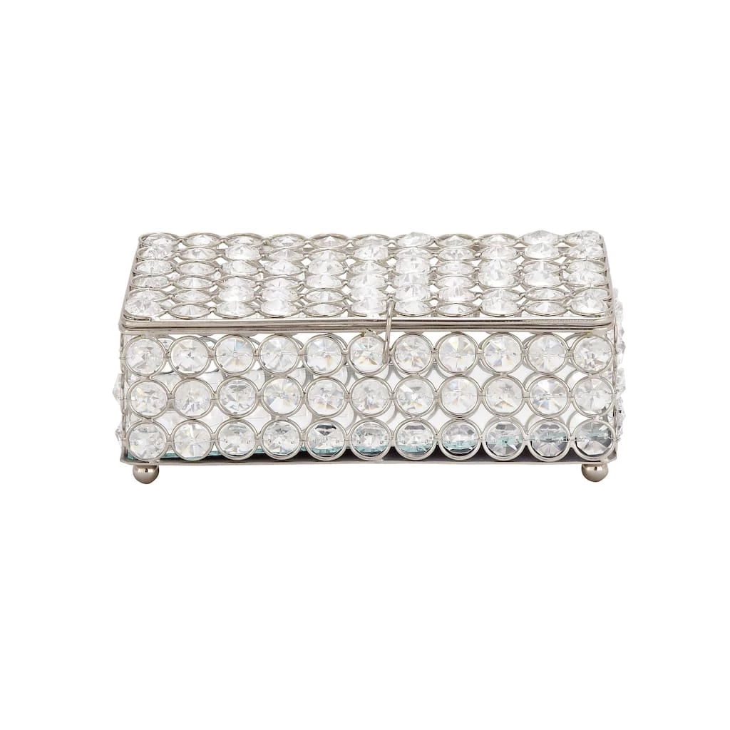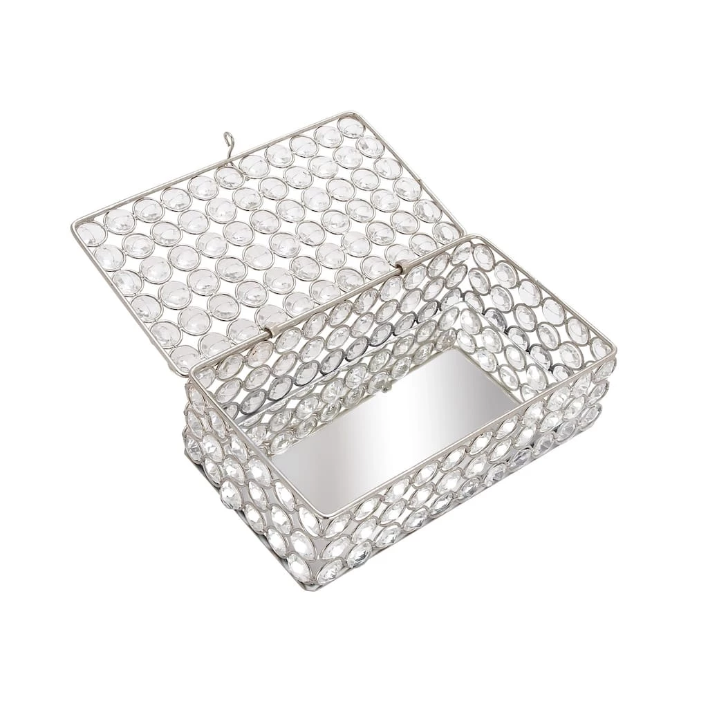 Posh and glamorous, this decorative box is a stunning jewelry box for your vanity or an eye-catching accent piece in your living room. Rows of round faux diamond crystals creative a kaleidoscopic, sparkling finish around the silver metal frame. Inside, the base is a reflective mirror for even more light-reflecting beauty. The crystal jewelry box is propped up by four round metal ball feet. Designed with black rubber stoppers at the base that prevent scratching furniture and table tops, as well as sliding around.