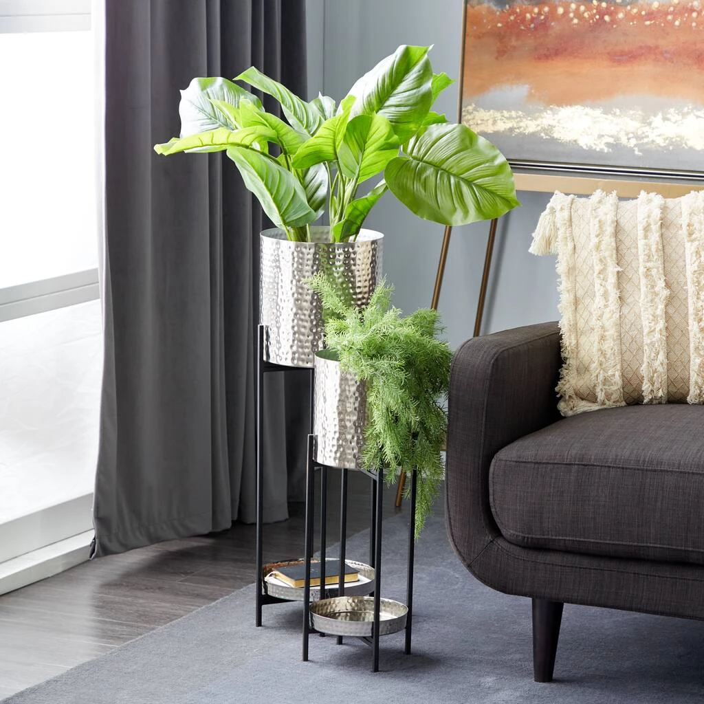 The features of these planters can complement almost any color palette, pattern, and texture. The solid construction of both stands and no-drainage pots are made of iron to add pizzazz to a corner of your living space.