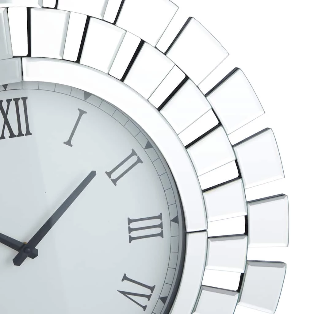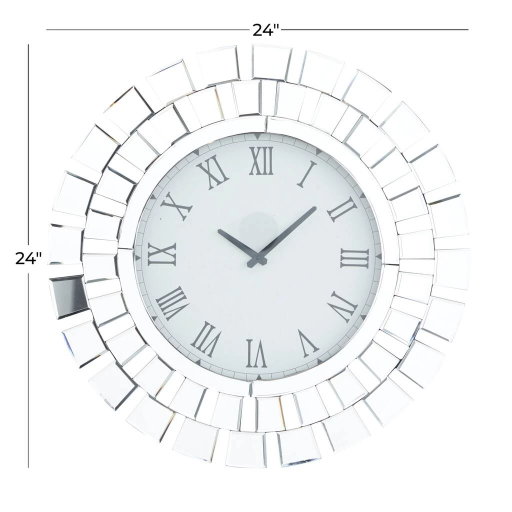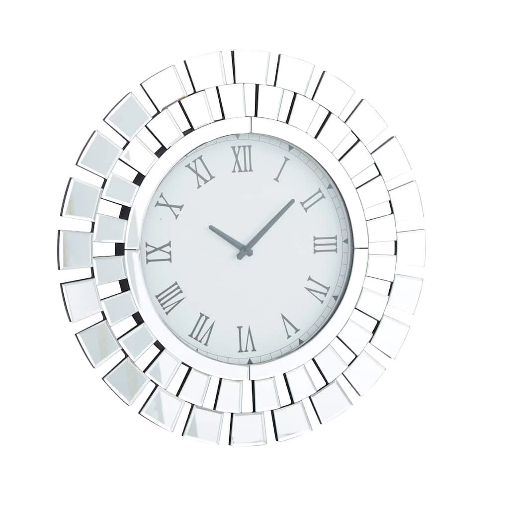 Like a functional art piece for your wall, this round wall clock will become a focal point or finishing touch for any room in your glam-themed home with its elegant glass accents. Take control of your day and keep track of time with this classic designed wall clock with a modern flare. Bring functionality and style into your home with statement wall clock to maximize any open wall space. Requires 1 AA battery. This item comes shipped in one carton. The clock face features white background with black roman numerals and clock hands. The clock mechanism runs silent.. Item comes with metal hardware at the back for easy and secure hang. Suitable for indoor use only. Glam inspired.
