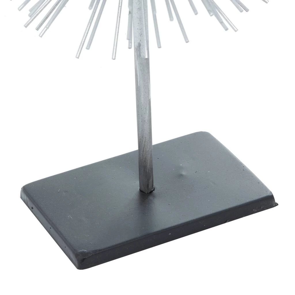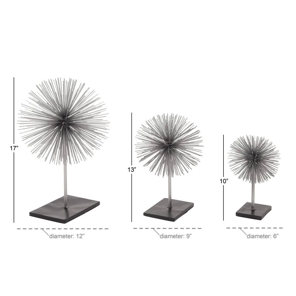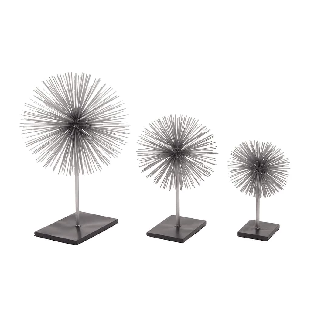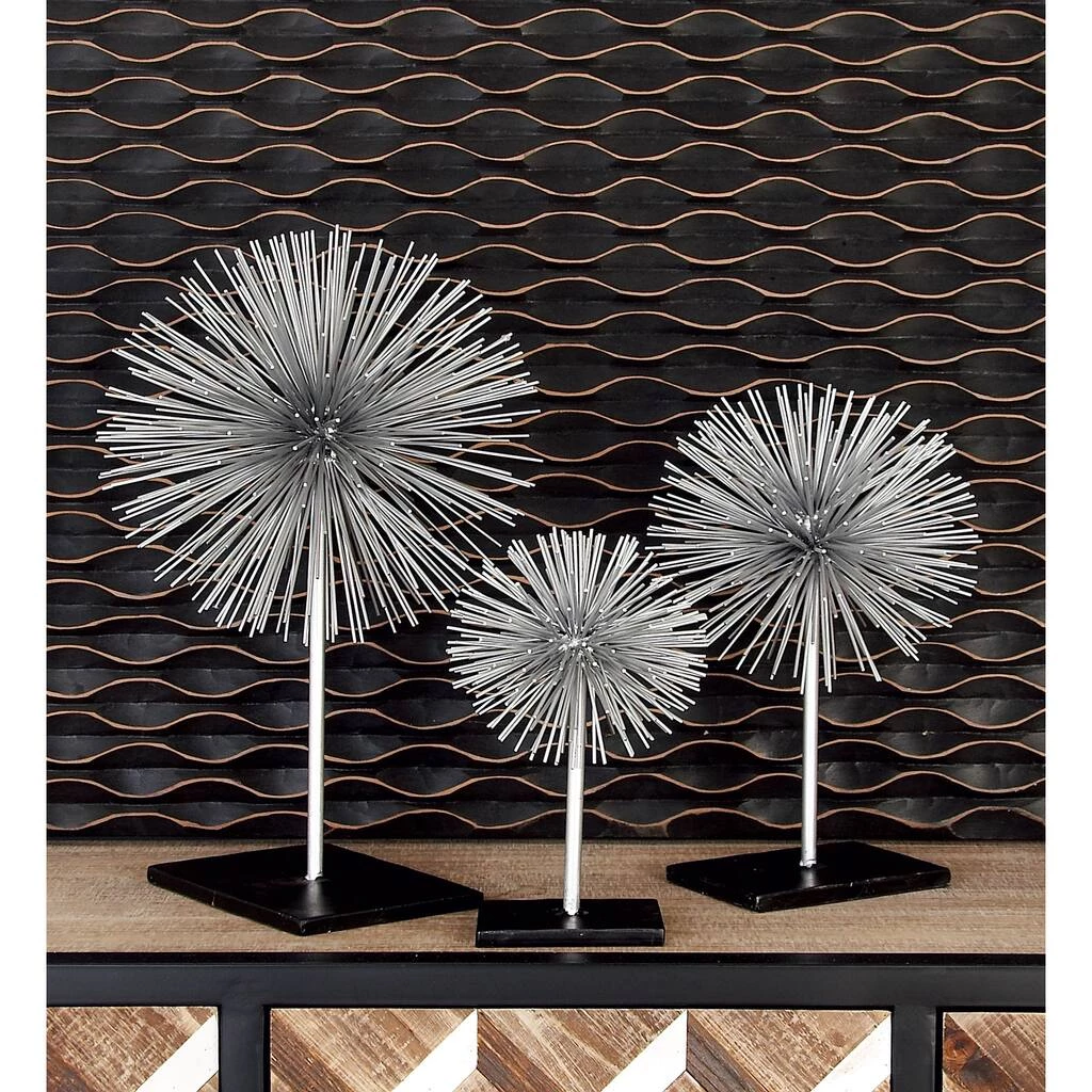 Who wouldn’t love this eye-catching piece? Add life to your space with this unique metal stand decor to complete the look of your contemporary home. This set of silver starburst accent pieces is made of pure metal with a high polished glossy finish. The set comes in 3 sculptures standing 10″, 13″, and 17″ tall on a black platform. This is the perfect accent dΓ©cor piece for any modern or contemporary styled home. Neat and structured backgrounds of contemporary and modern homes make the best platforms of display. Designed with black rubber stoppers at the base that prevent scratching furniture and table tops, as well as sliding around. Wipe clean with a dry cloth. Suitable for indoor use only. This bursting star metal art comes as a set of three. Contemporary design. This item comes shipped in one carton.