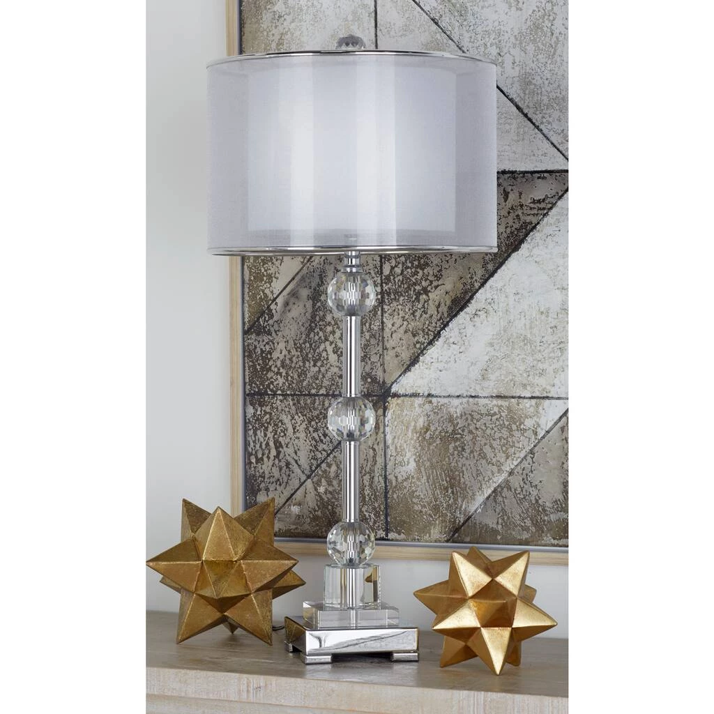Brighten up any room to create a warming atmosphere for you and your guests with this chic table lamp. Make a statement with this unique lamp on mantle, console table or in any living space. This silver table lamp provides a beautiful light source for your room. With its sleek design and finish as well as easy-on-the-eye light shade, this accent table lamp is the ideal addition to any setting. A socket for a medium-sized E26 bulb. Cord length is 65 inches. Suitable for indoor use only. Features shiny white drum-shaped shade with 14βL x 9βH measurements, and has a spider/harp fitter. Comes with an on/off switch. Glam style. This item ships in one carton.