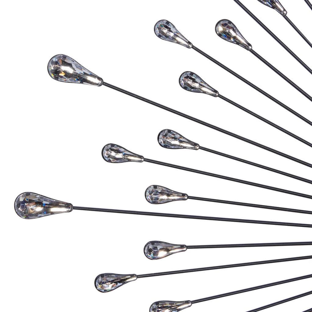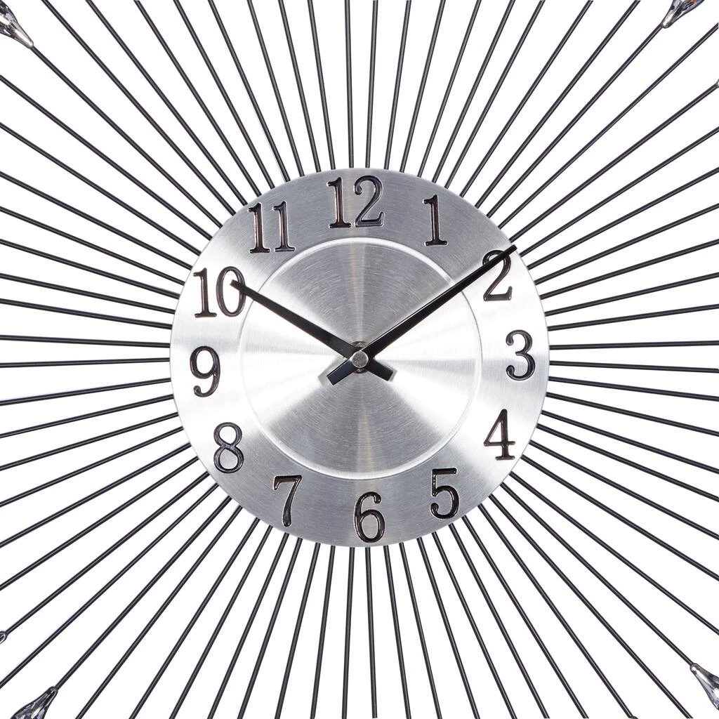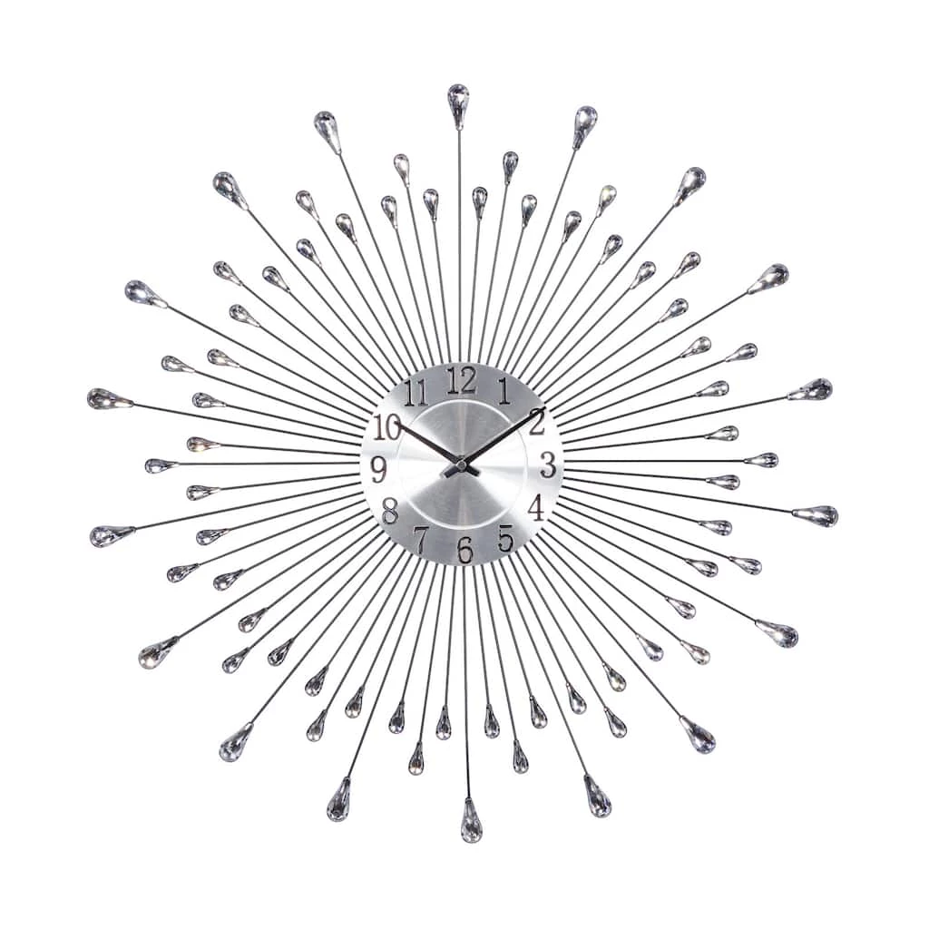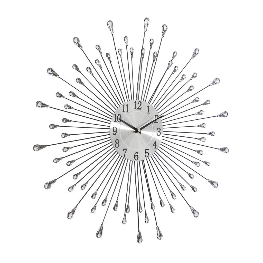 Create an interesting portion of a wall in your modern inspired living space by adding this modern style silver metal sunburst with droplets wall clock. This metal clock features a uniformed pattern of sunbursts stemming from the small clock face with small silver droplets at the tips creating a beautiful and symmetrical pattern. The clock face is polished silver with Arabic numerals and short hour and minute hands for a clean and minimalist look. This silver finish wall clock will make a creative focal point in your modern home. Runs on one AA battery (not included). This item ships in one carton. Arabic numerals for the hour markers. The clock mechanism runs silent. Easily hanging using hanging hardware on the back. Suitable for indoor use only. Modern Design.