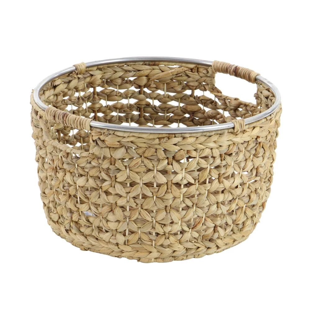 Beautifully handmade with an open weave chain link design, this set of round, natural-colored seagrass baskets give you plenty of stylish storage with a modern touch from the metal ring tops. The large, round body of each wicker basket is handmade from seagrass cords woven throughout a hard wicker frame, creating a unique textural design. Each rattan basket is easy to carry with two rectangular spaces forming handles at the top. The polished silver metal rings along the tops, woven in place with rattan rope, add modern flair to these decorative storage baskets.