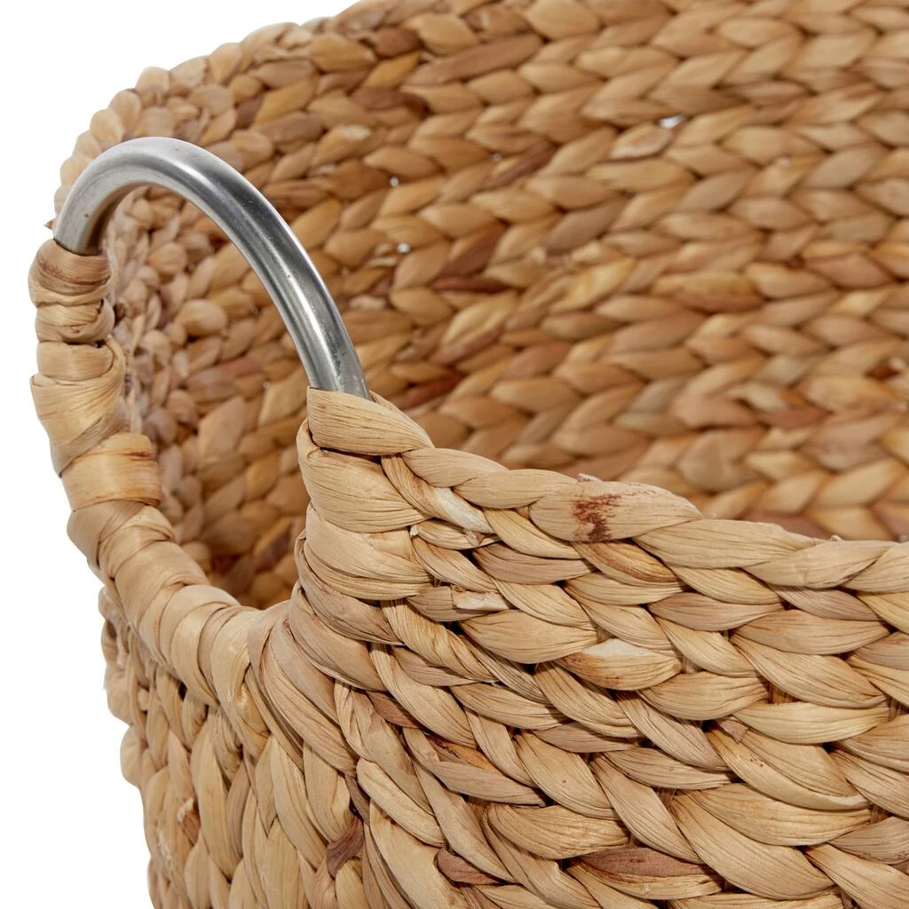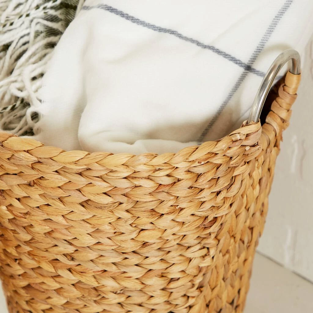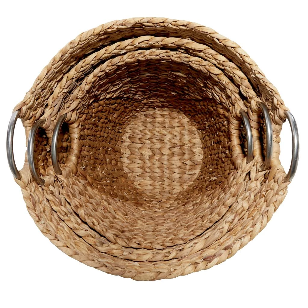 These nesting natural seagrass baskets with tall cylinder bodies are great for large storage! The neutral blonde tone works with any color palette, the wicker braided texture brings a beachy vibe, and the silver metal handles are easy to carry while adding an updated, contemporary accent. Use as laundry baskets, planters, or fill with decorative orbs. Due to the handmade nature of this item, no two will be alike, there will be slight differences in shape, size, and color.