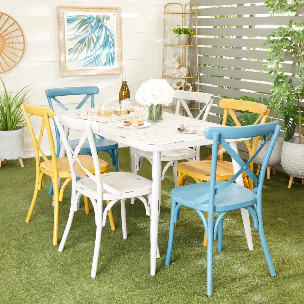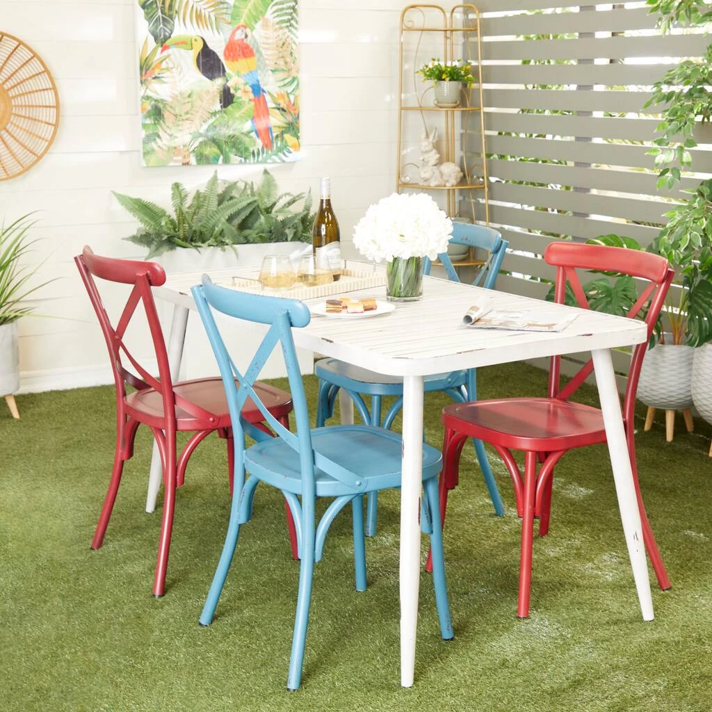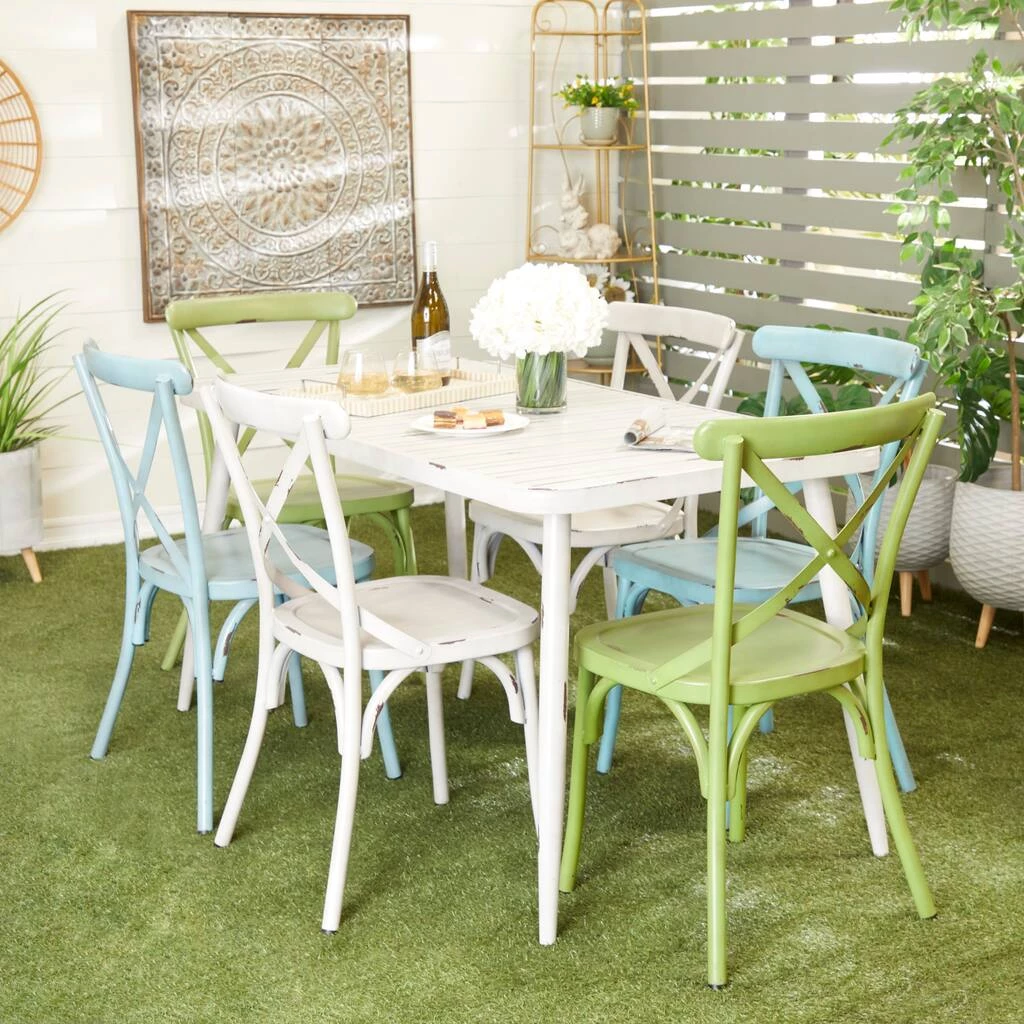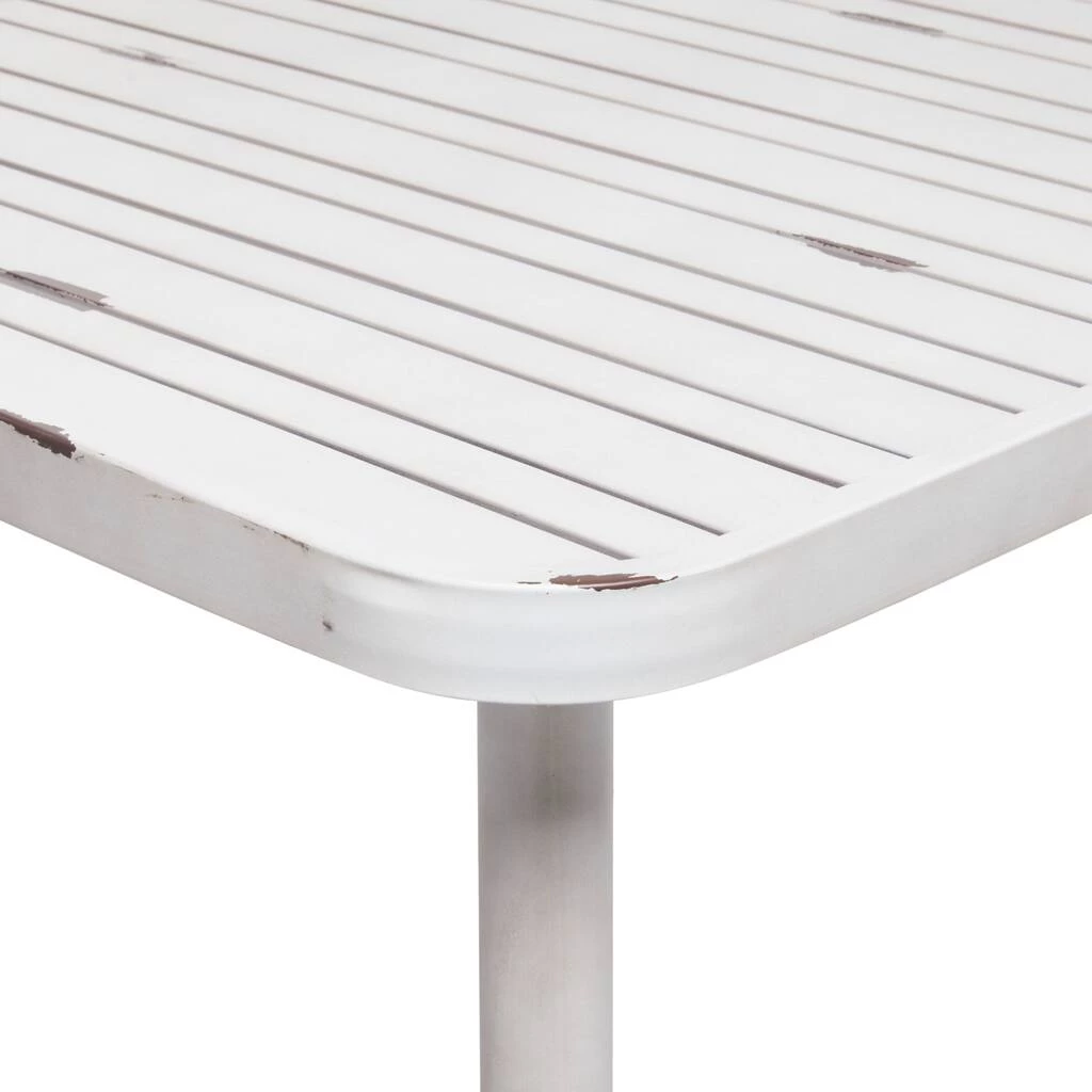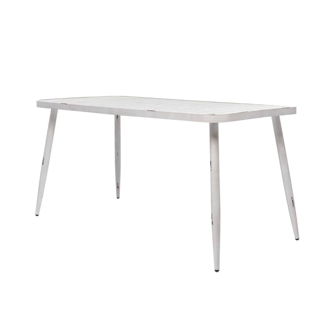 Celebrate family patio nights in a stylish way as you pair up this versatile indoor and outdoor dining table with your choice of white-toned metal chairs. Make your outdoor patio your perfect getaway with this sleek and spacious table. Designed with black rubber stoppers at the base that prevent scratching furniture and table tops, as well as sliding around. Farmhouse style. A lightweight aluminum that is both rust and water-resistant for long term use. Easy to clean simply hose down with water. Suitable for indoor and outdoor use. This item is shipped in one carton. This dining table can accommodate a 4-6 person seating capacity (chairs not included). Maximum weight limit is 100 lbs.