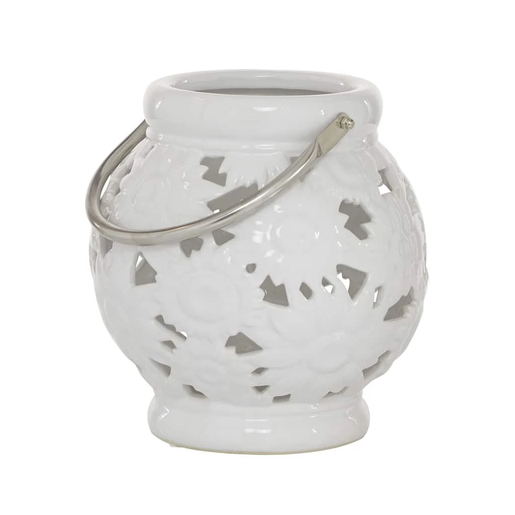 Impress your guests with this lovely table lantern. An embossed floral design ensures this white lantern looks gorgeous even before you light a candle. Once you do insert a candle, the light will escape through the perforated shell and give the space a calming glow. An attached handle makes it easy to move the round light fixture from room to room. This item ships in 1 carton. This candle lantern is meant to sit on top of surfaces but it can also hang via its metal handle. Suitable for indoor use only. Contemporary design. Lantern candle holder can hold 1 pillar candle.