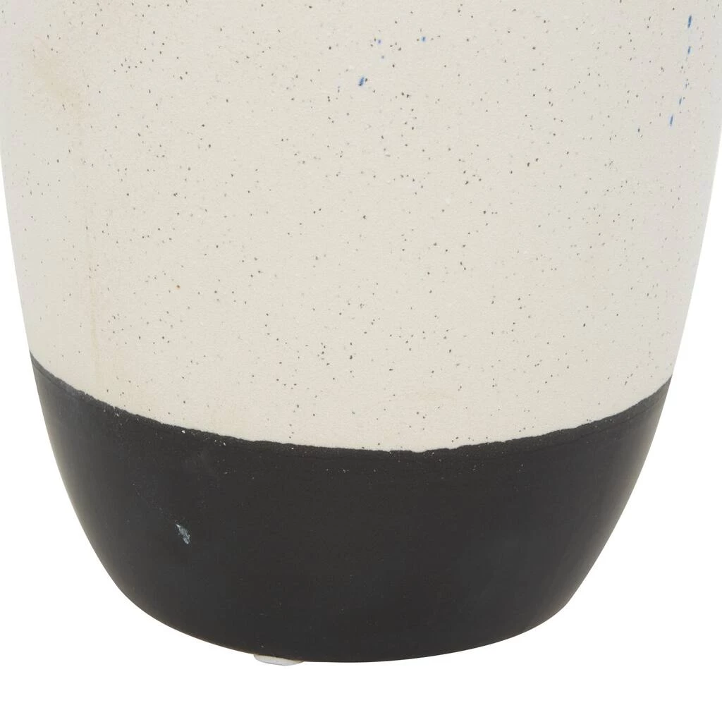 Alone or holding a bold piece of vase filler, this large, round ceramic vase features lovely handmade detail and a large bottle shape. The small top with no lip has a bud vase style for displaying a single-stemmed botanical, but also makes for an eye-catching stand-alone accent decor centerpiece. The blue hues swim together and fade from soft black and deep forest green into navy and royal blue with delicate, sweeping brushstrokes contrasting the matte white gritty body. The tapered base is finished in matte black. Due to the handmade nature of this item, no two will be alike, there will be slight differences in shape, size, and color. These versatile yet bold colors make a lovely splash in elevated coastal decor spaces or contemporary decor homes and offices. This item ships in one carton. Suitable for indoor use only. Jar vase with narrow rim opening. Contemporary design.