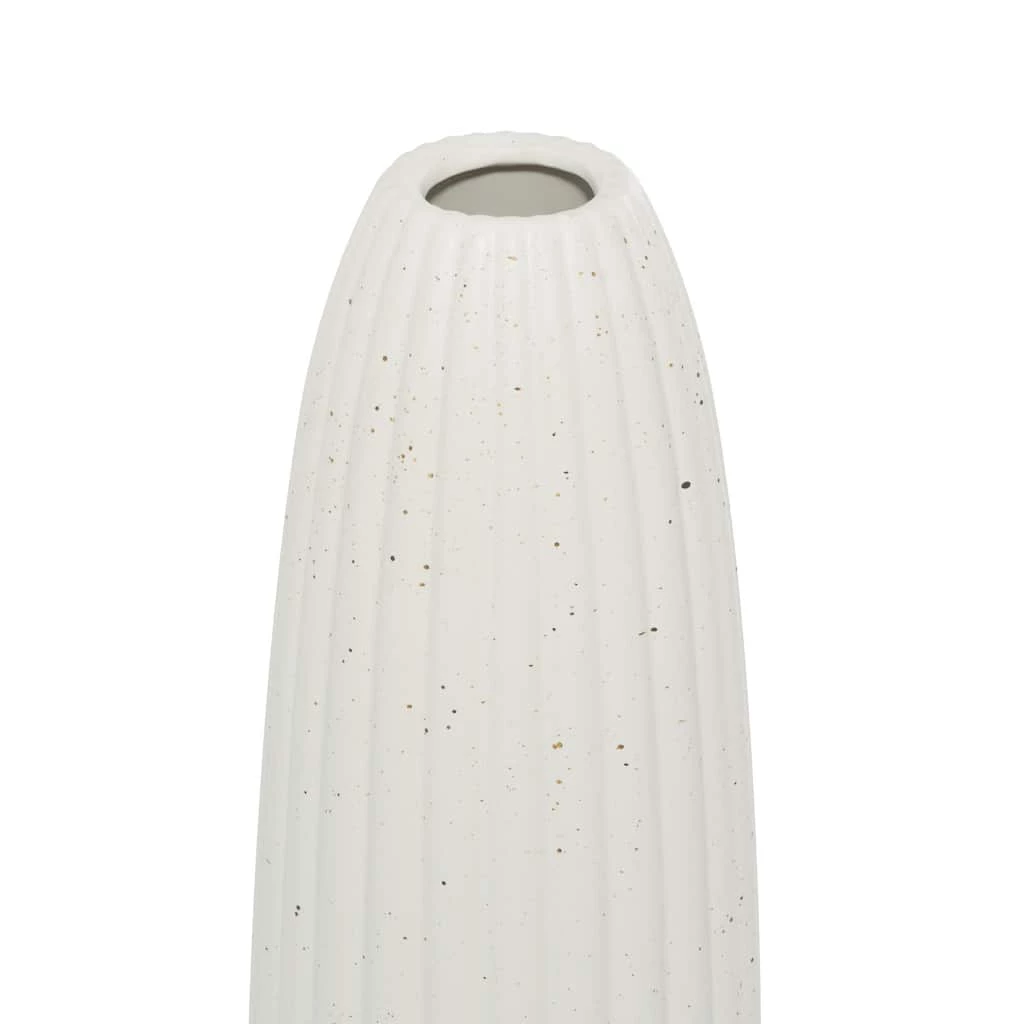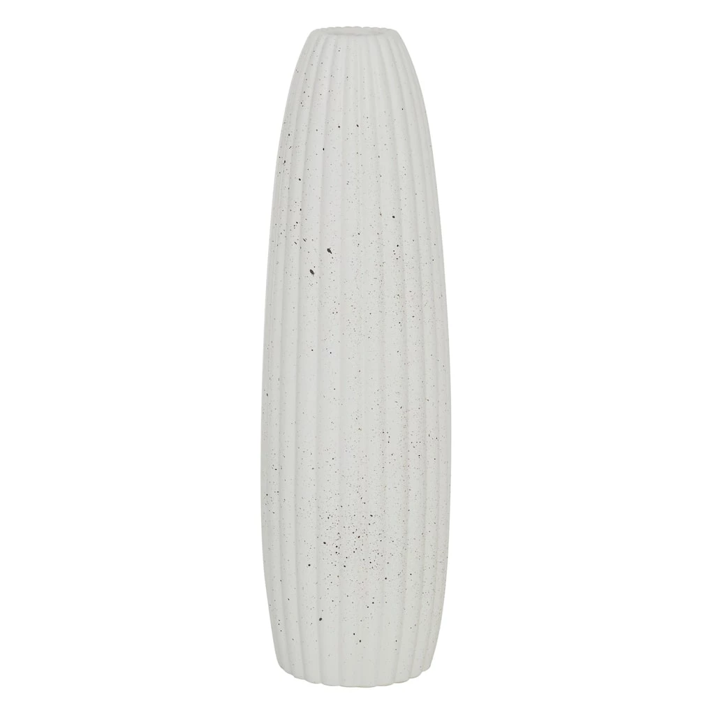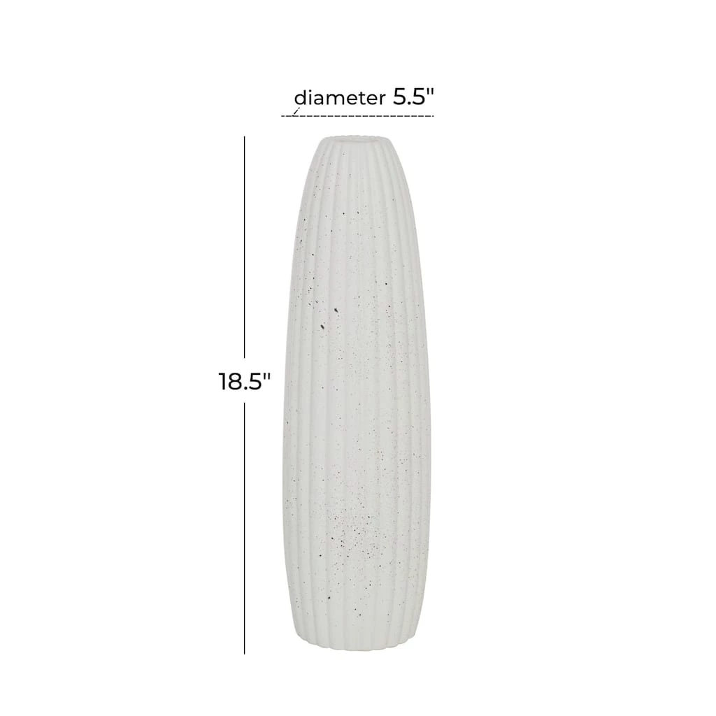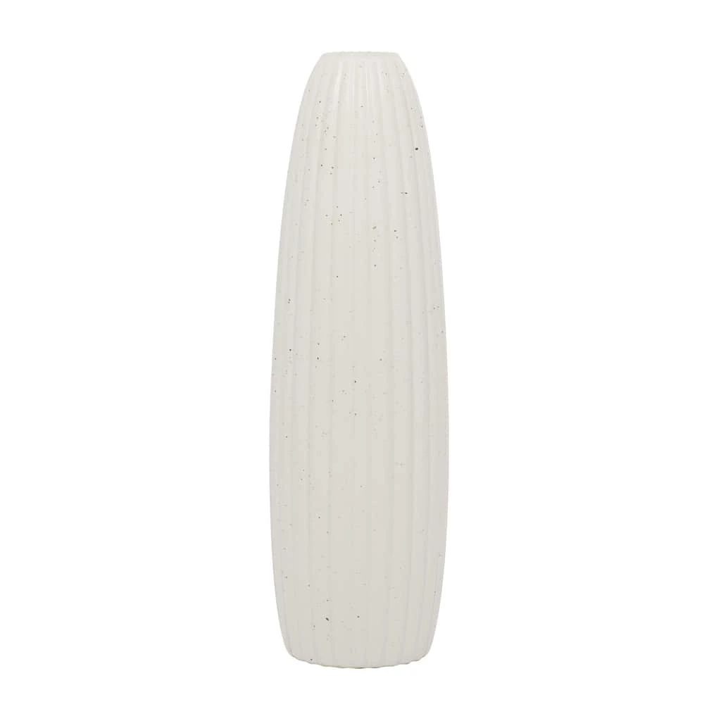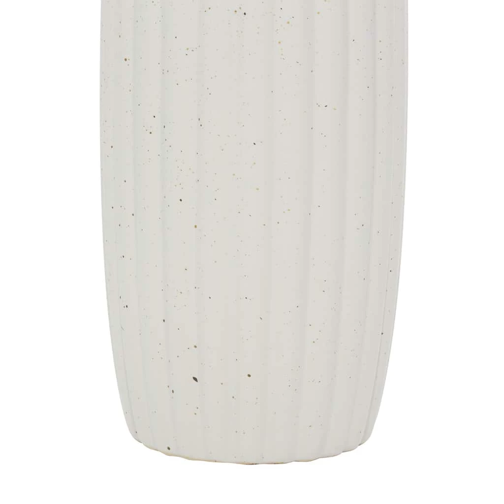 This svelte, elegant vase features a tall, narrow silhouette with a gourd texture throughout the cylindrical body. The small opening at the top has no lip, a very modern touch, and allows for a small bundle of vase filler to be prominently displayed. The eggshell white finish is soft and matte and has some light speckling for a pop of subtle texture. This decorative vase will work with any color palette or pattern and especially pops in contemporary style spaces. This item ships in one carton. Suitable for indoor use only. Cylinder table vase with narrow rim opening. Contemporary design.