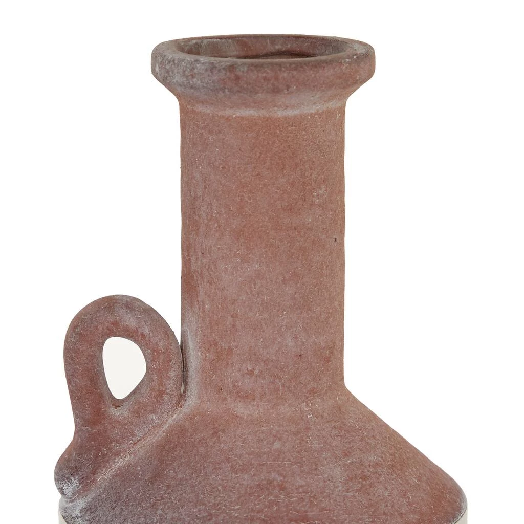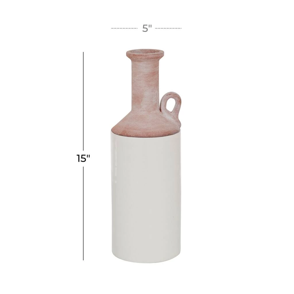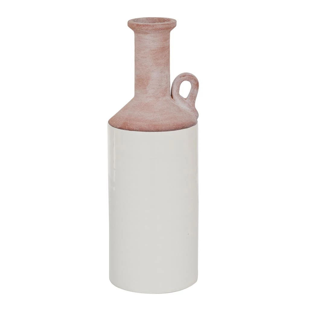 This stylish ceramic vase features chic color blocking and a pitcher silhouette. The top portion is a matte, textural red terracotta, or un-glazed natural stoneware. The tall neck has a rounded mouth and small loop handle beneath. The lower portion of this table vase features a glossy, opaque white glazed finish over its cylindrical body. This decorative vase looks lovely on its own but embellish with dried flowers, twigs, or other small vase decor for a contemporary look. This item ships in one carton. Suitable for indoor use only. Tapered neck pitcher vase with fluted lip rim opening. Farmhouse-themed style.