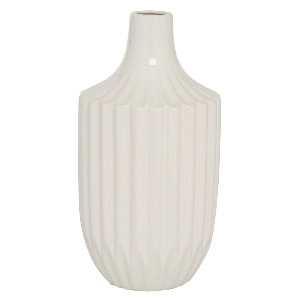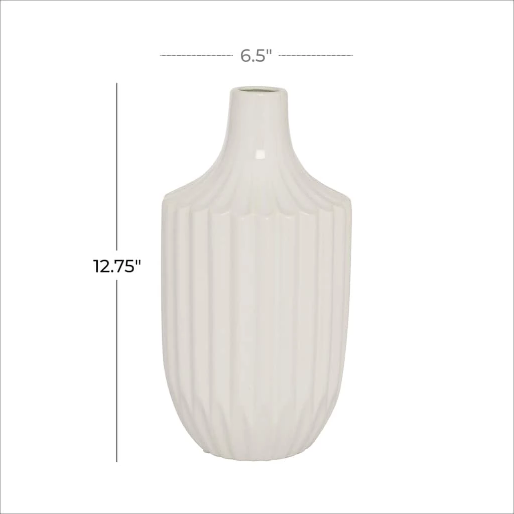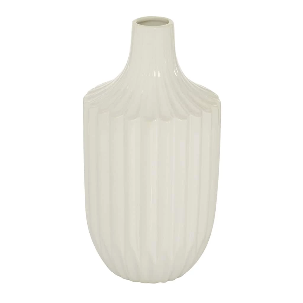 Sometimes, less is more and simple is stately. Such is the case with this white pillar vase, featuring dimensional vertical grooves and a bud vase opening. The ceramic vase body is finished in a thick, opaque, high-gloss white glaze, which serves to accentuate the beautifully carved vase body. This contemporary decor makes a great statement piece on its own, but also will make your floral bouquets or tall vase filler truly pop in your space. This item ships in one carton. Suitable for indoor use only. Tapered neck bud vase with narrow rim opening. Modern Design.