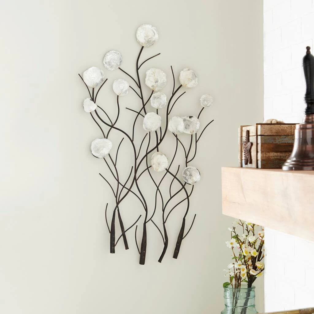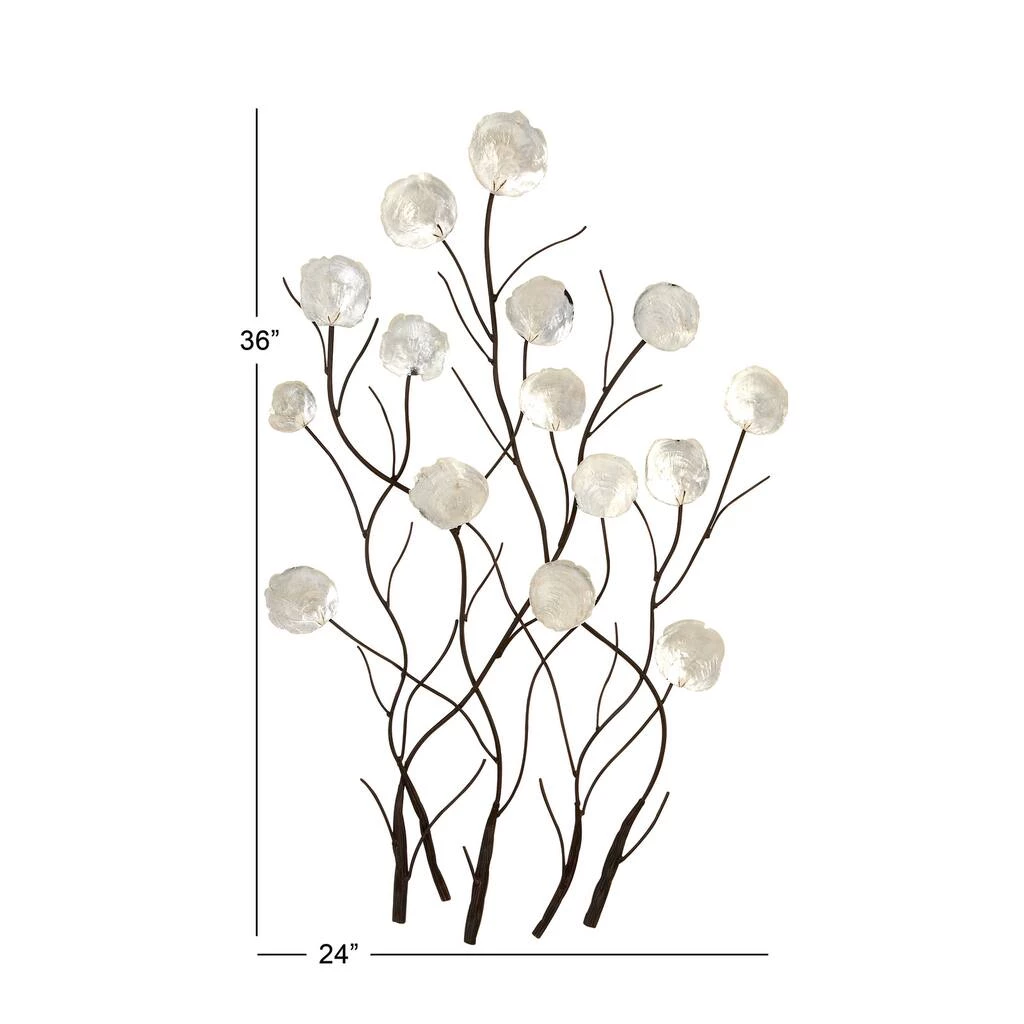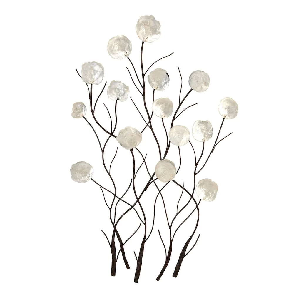 This large metal wall accent features metal tree branches with natural capiz shells. It emanates a coastal vibe with its round, opalescent white shells that form bright blossoms atop the wavy black branches. This accent is sure to transform your living room.