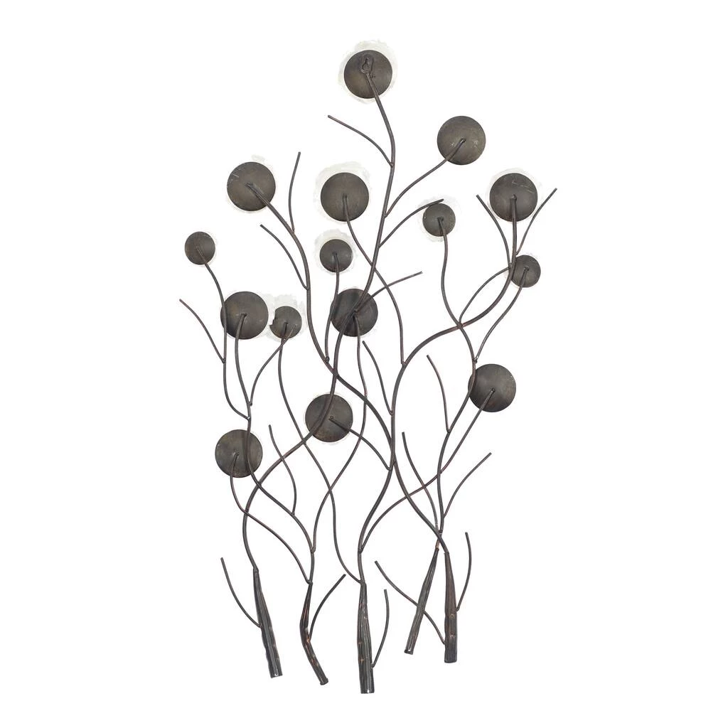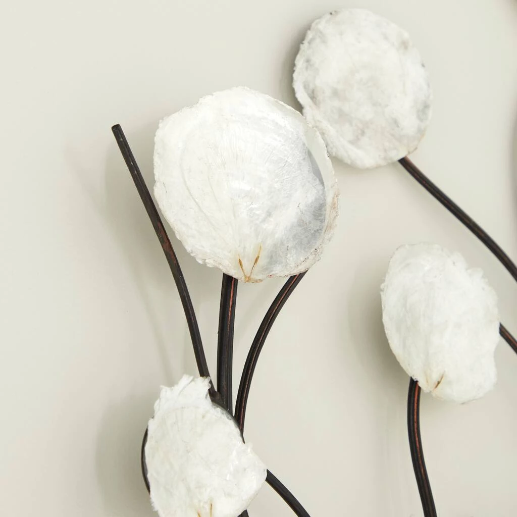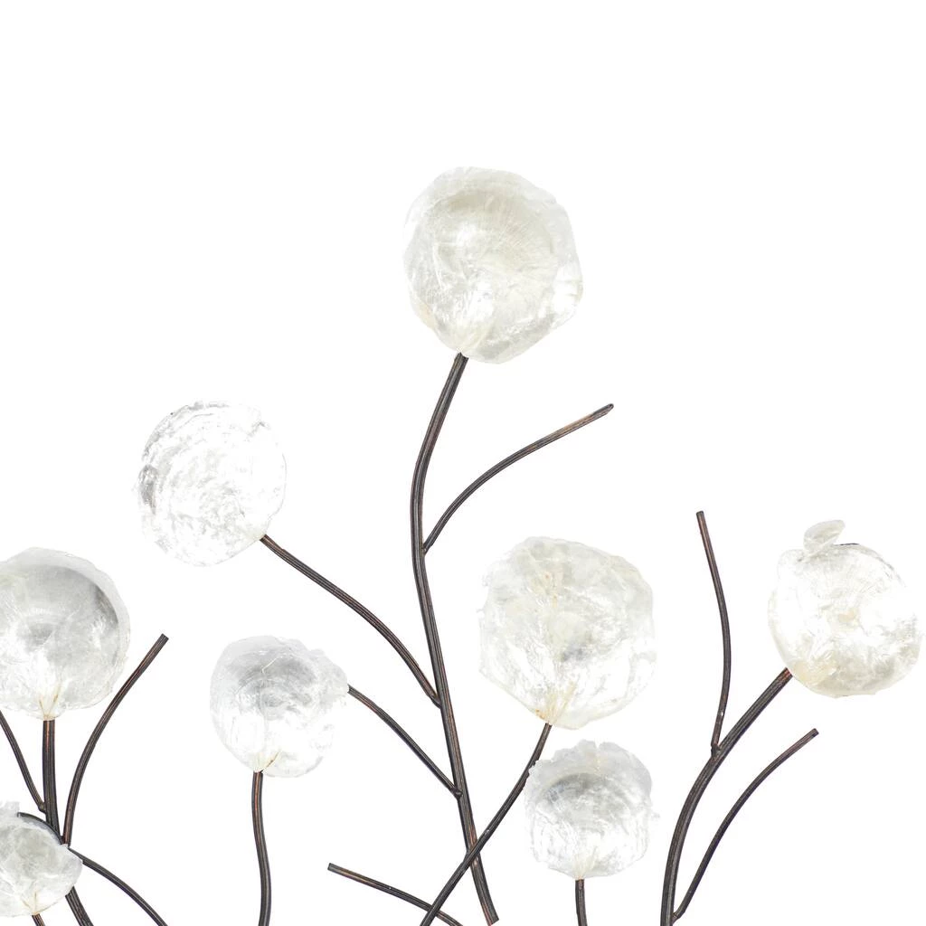 This large metal wall accent features metal tree branches with natural capiz shells. It emanates a coastal vibe with its round, opalescent white shells that form bright blossoms atop the wavy black branches. This accent is sure to transform your living room.