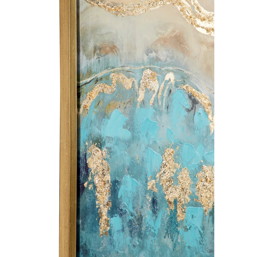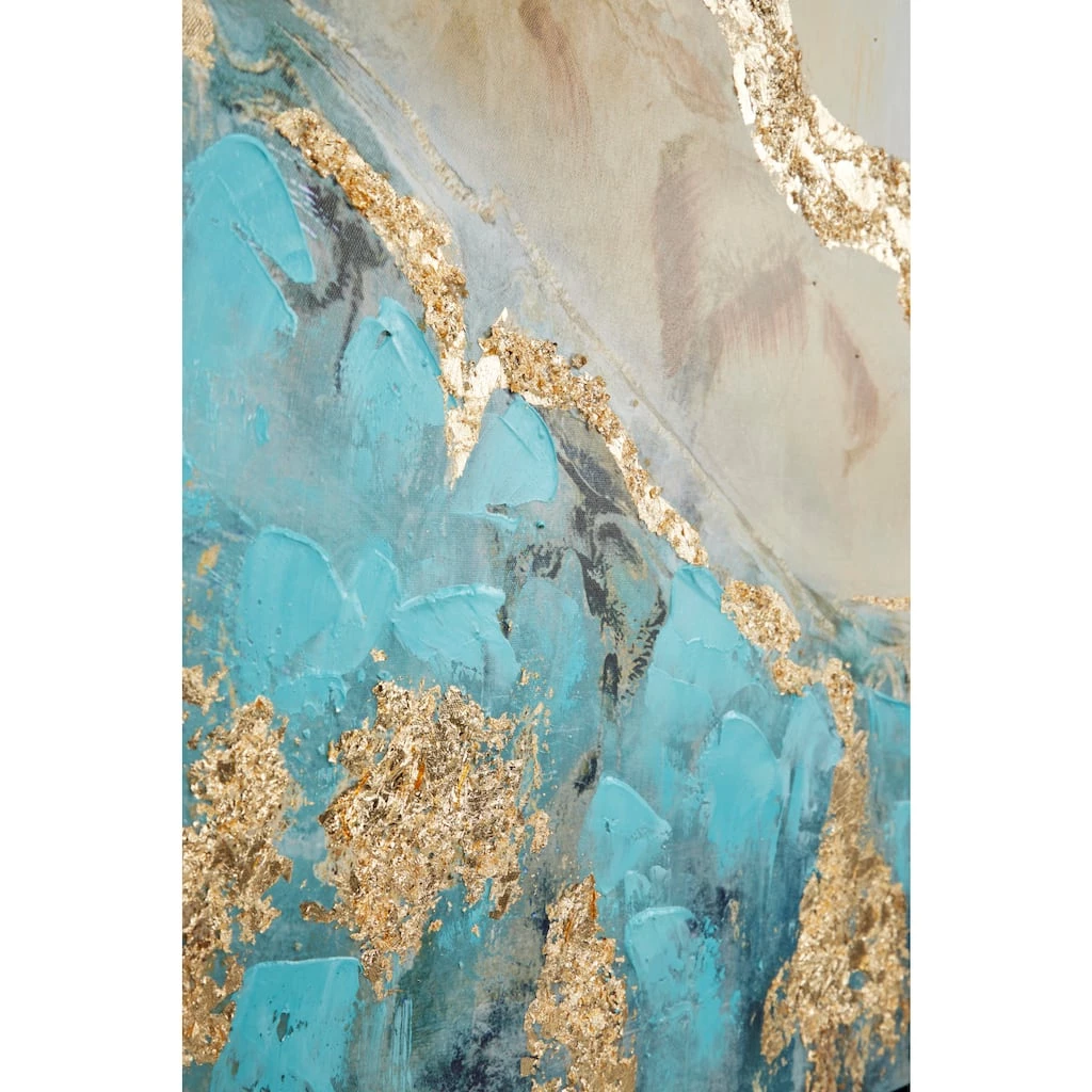 Brilliant in both hue and expression, this abstract art painting brings a contemporary style with palpable texture to your space. Like the semiprecious stone, the turquoise hues throughout this acrylic painting are beautiful and bright with a green undertone. Metallic gold is painted over layers of dried acrylic paint to form a 3-dimensional texture that looks like gold leaf over the earthy brown, soft gray, and black colors. Even more textures swim throughout this gold and turquoise painting, from the soft, blended background that looks like falling heavy rain to a ridged, jagged, metallic gold mountain range sitting atop heavy, bold blue paint knife strokes jumping out from the canvas. But let this abstract painting speak to you to form your own interpretation.