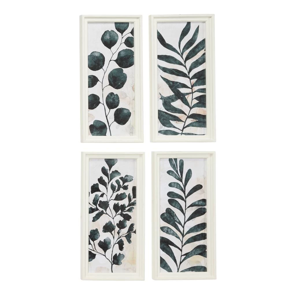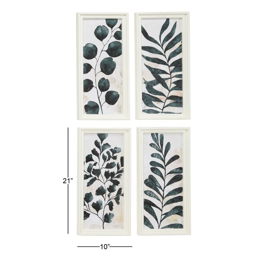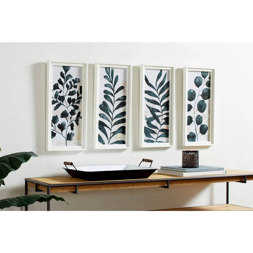 This set of four wall dΓ©cor pieces feature separate dark green illustrations with dimensional water color looks over white backgrounds, each framed in a white wood frame. Symmetrical in size, these plant prints each have their own styles unified by matching hues and frames that can be hung side by side or forming a square shape.