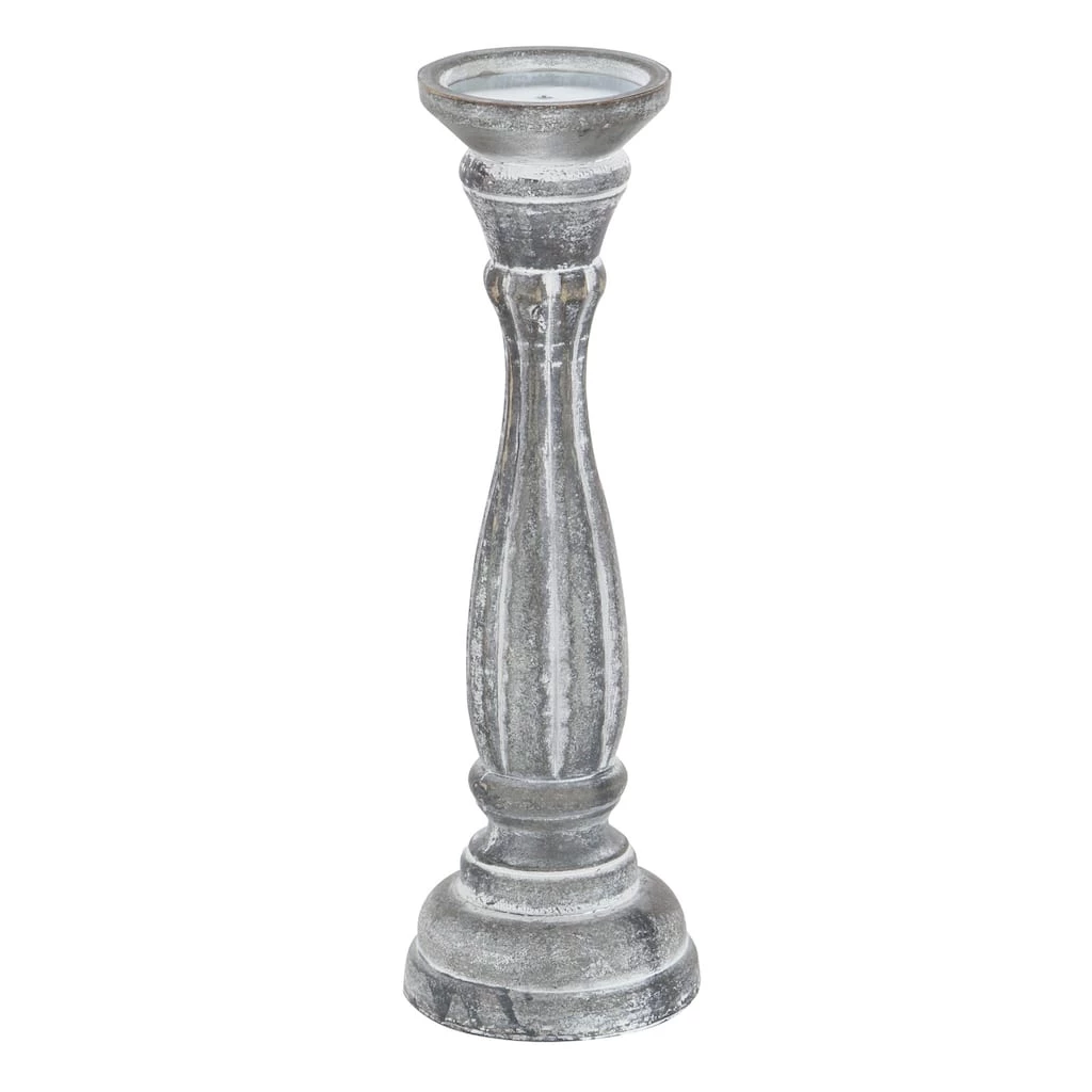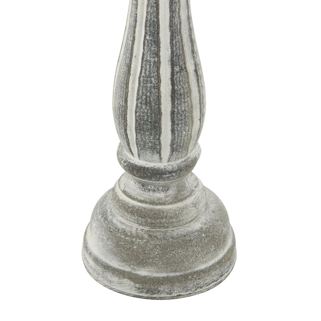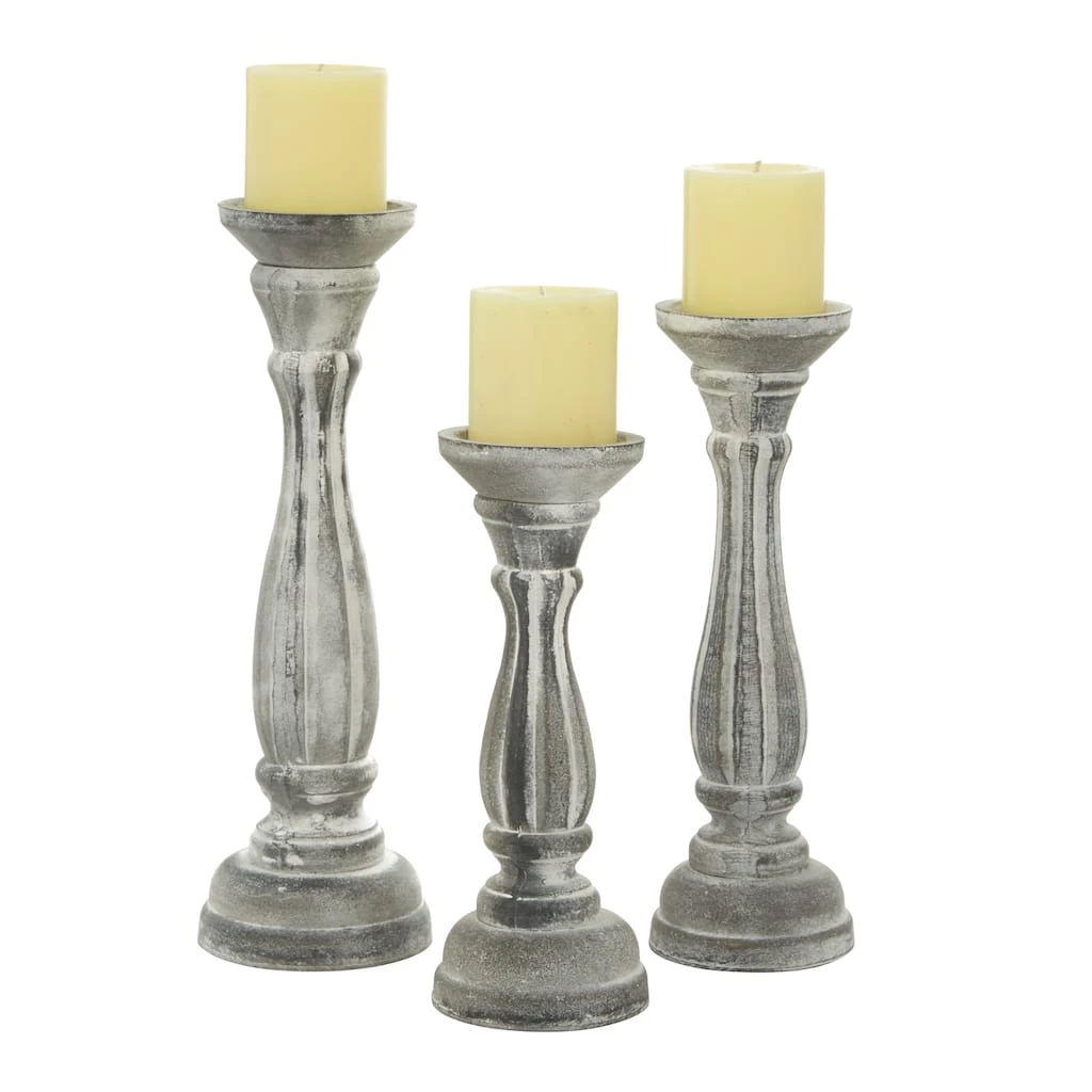 These hand-carved whitewashed pillar candle holders are the finishing touches you are looking for in your shabby and cottage chic interiors. The architectural column-like silhouettes and carved ridges were crafted from dark pinewood and then, given a distressed neutral hue. Use them as dim light holders in the dining area or as centerpieces on top of dressers and side tables. Designed with black rubber stoppers at the base that prevent scratching furniture and table tops, as well as sliding around. Each pillar candle holder can accommodate 1 votive or pillar candle. This item comes shipped in 1 carton. Suitable for indoor use only. This set includes 3 candle holder. Traditional theme.
