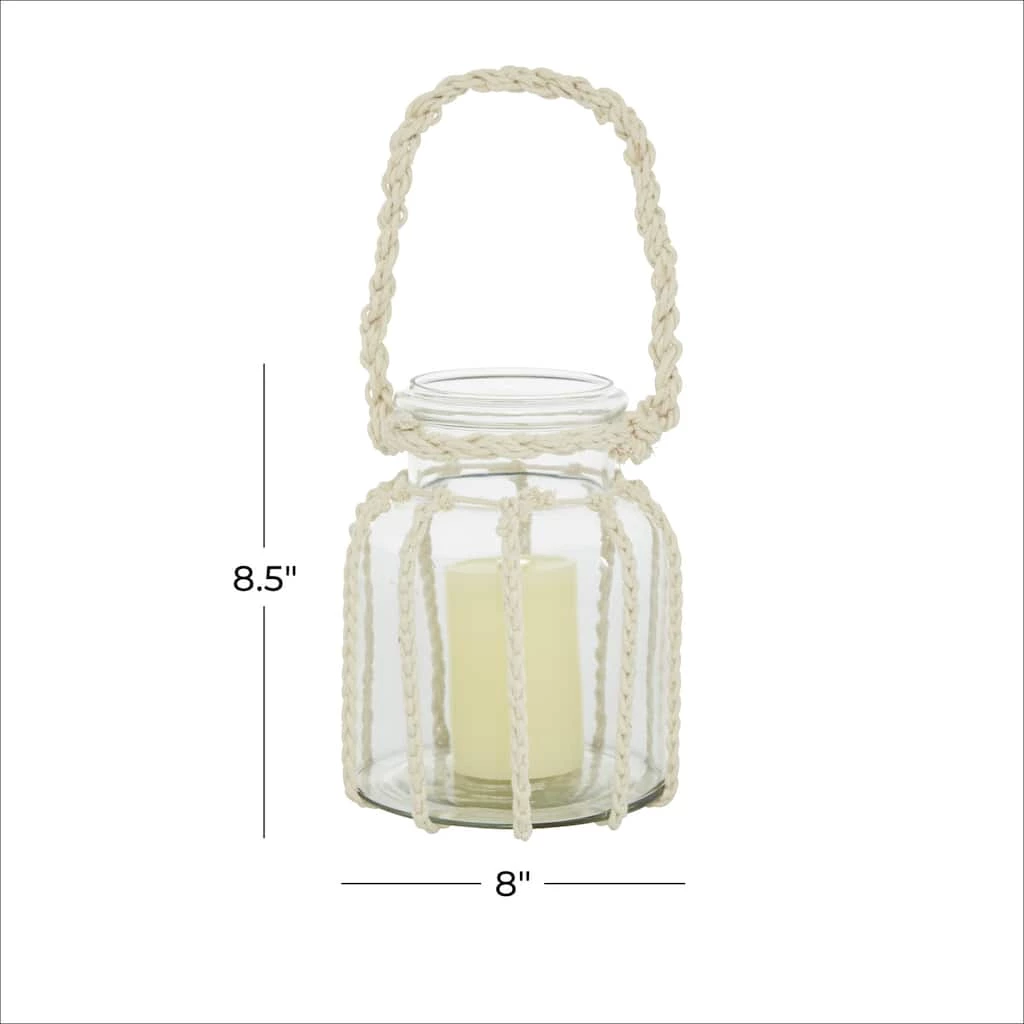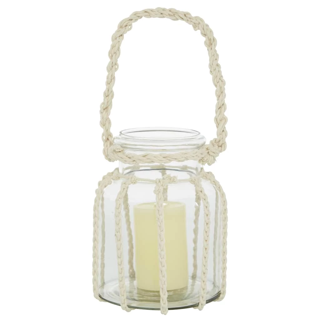 Display as accent piece on your console of coffee table. For that natural look, it flaunts an array of macrame braided rope details. Delight your guests and make any occasion extra special by displaying this elegant lantern as your centerpiece. Lantern candle holder with 1 candle each. This item ships in 1 carton. Rope handle for easy displaying. Suitable for indoor use only. Made in India. Coastal design.
