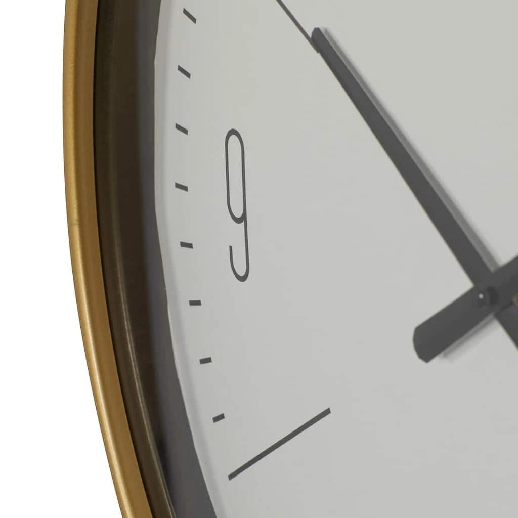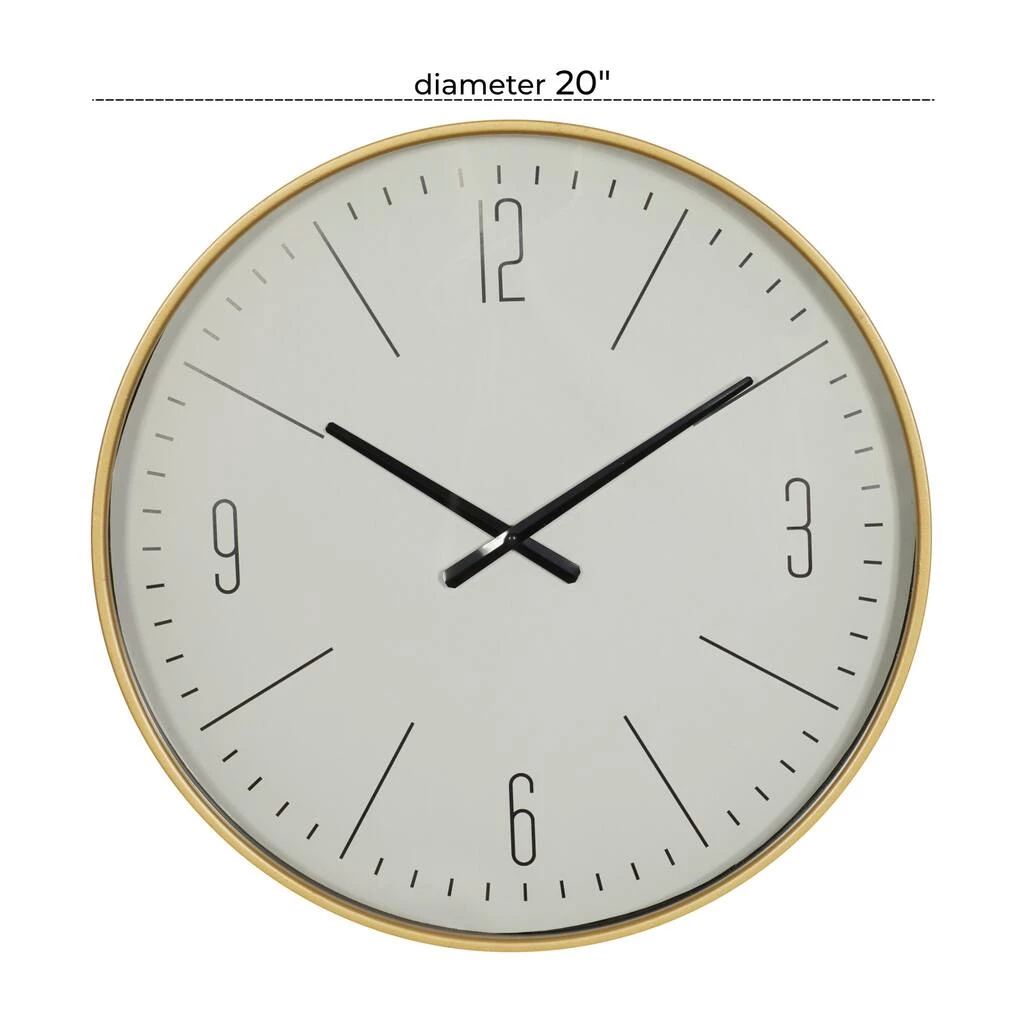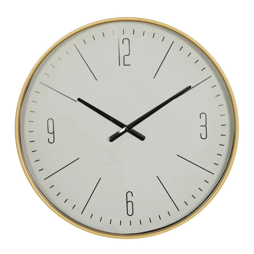 Time is a universal constant which you do not have control of. However, this vintage style white and gold round metal wall clock can bring time to a standstill when you admire it in your beautiful traditional inspired home. This unique piece features a round design with a slim and elegant gold finish metal border frame. The hour and minute hands are in a black finish together with the hour and minute markers. The hour markers only show 3, 6, 9, and 12 in Arabic numerals while the rest are in line bars. This elegant clock would definitely make an excellent focal point for your walls paired with some accent tables, and other decors of the same genre in your traditional inspired living space. 1 AA battery required (not included). This item ships in one carton. Features Arabic numerals for 12, 3, 6, 9 markers with minutes. The clock mechanism runs silent. Metal secure loop backing for easy hang. Suitable for indoor use only. Contemporary design.