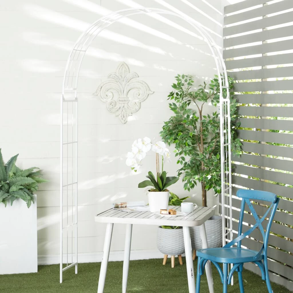 Let your cottage inspired garden be filled with storybook pieces as you place this towering arch in front of the garden entrance and style it up with growing plant vines. A creative way to add a welcoming look with bold design into your outdoor setting. Make your outdoor space fun and inviting with this stylish garden arbor. Contemporary style. Suitable for outdoor and indoor use. This item is shipped in one carton . Avoid using abrasive cleaning pads or detergents, use a sponge with mild soap and warm water, then rinse with a garden hose. Iron structure is painted with a special coating to help protect it from the elements. Iron may show signs of corrosion in salt air environments.