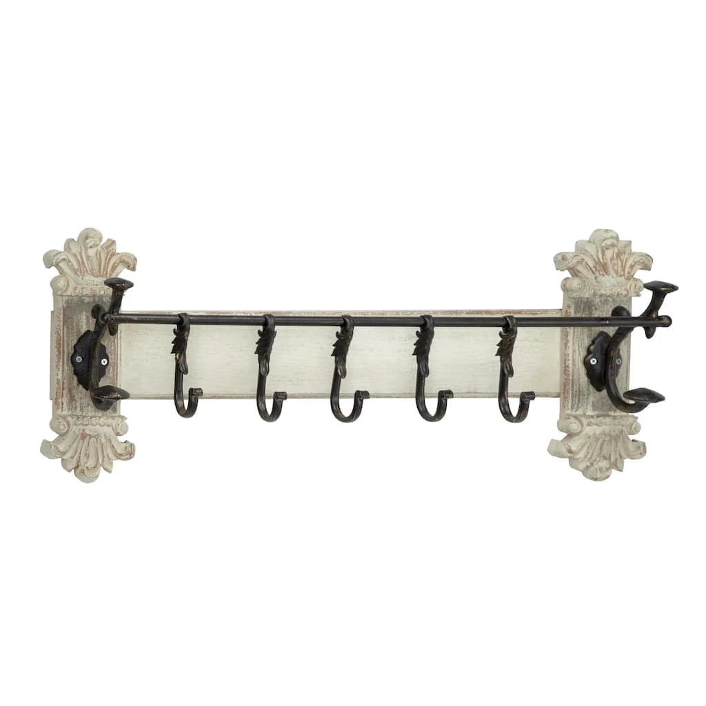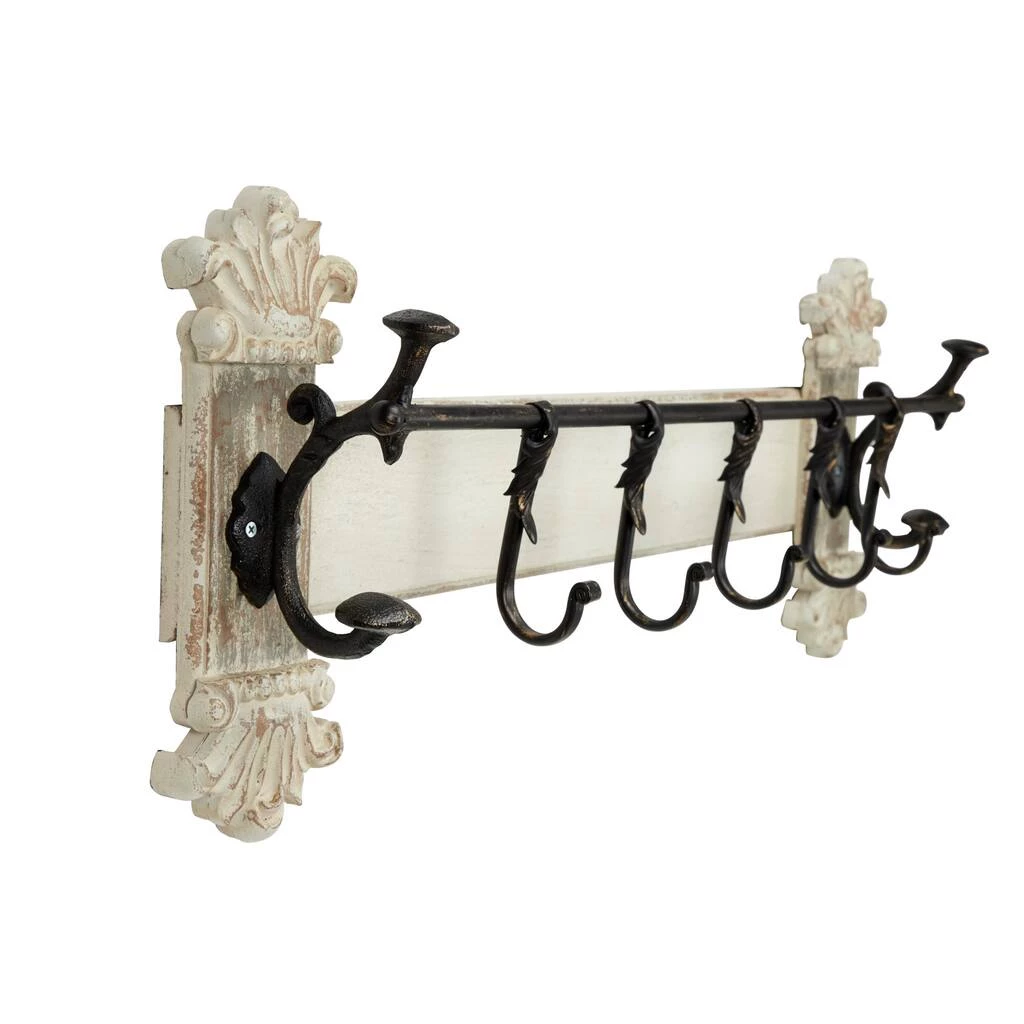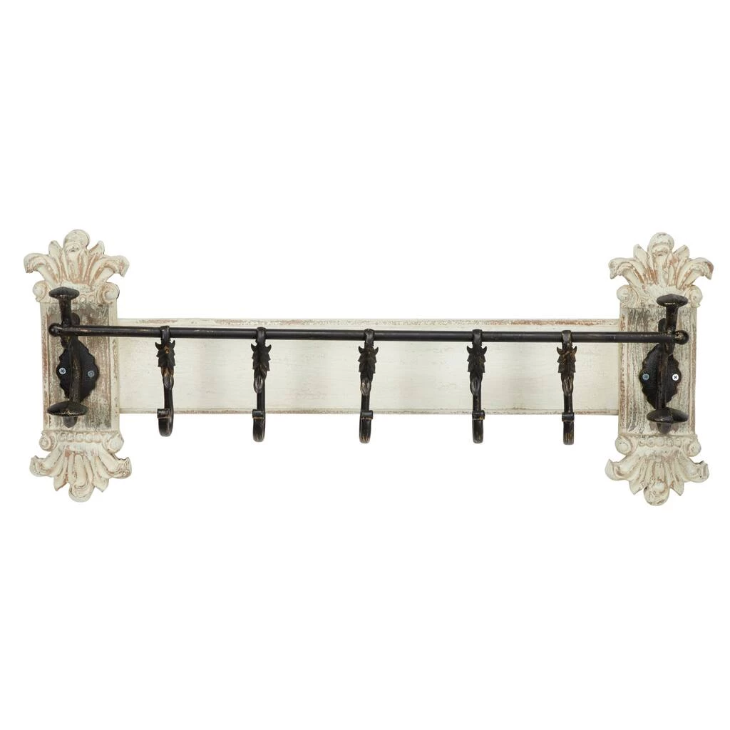 This antique-inspired wood wall rack features 7 iron hooks and carved acanthus accents. Whether you display wall decor or hang lightweight jackets, this vintage style accent decor makes a stunning entryway centerpiece with functionality. The distressed eggshell white finish is soft and neutral, suitable for vintage, French Country, and Country Cottage styled spaces, along with the decorative distressing for an antique feel. This item comes shipped in one carton. Easy to horizontally hang by sawtooth hardware in back; 7 metal hooks measure 5β each. Suitable for indoor use only. Each hook holds 5 to 8 lbs. Vintage inspired.