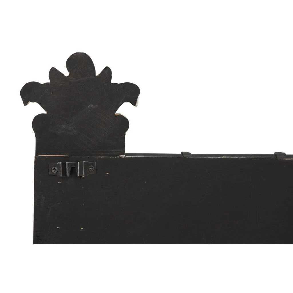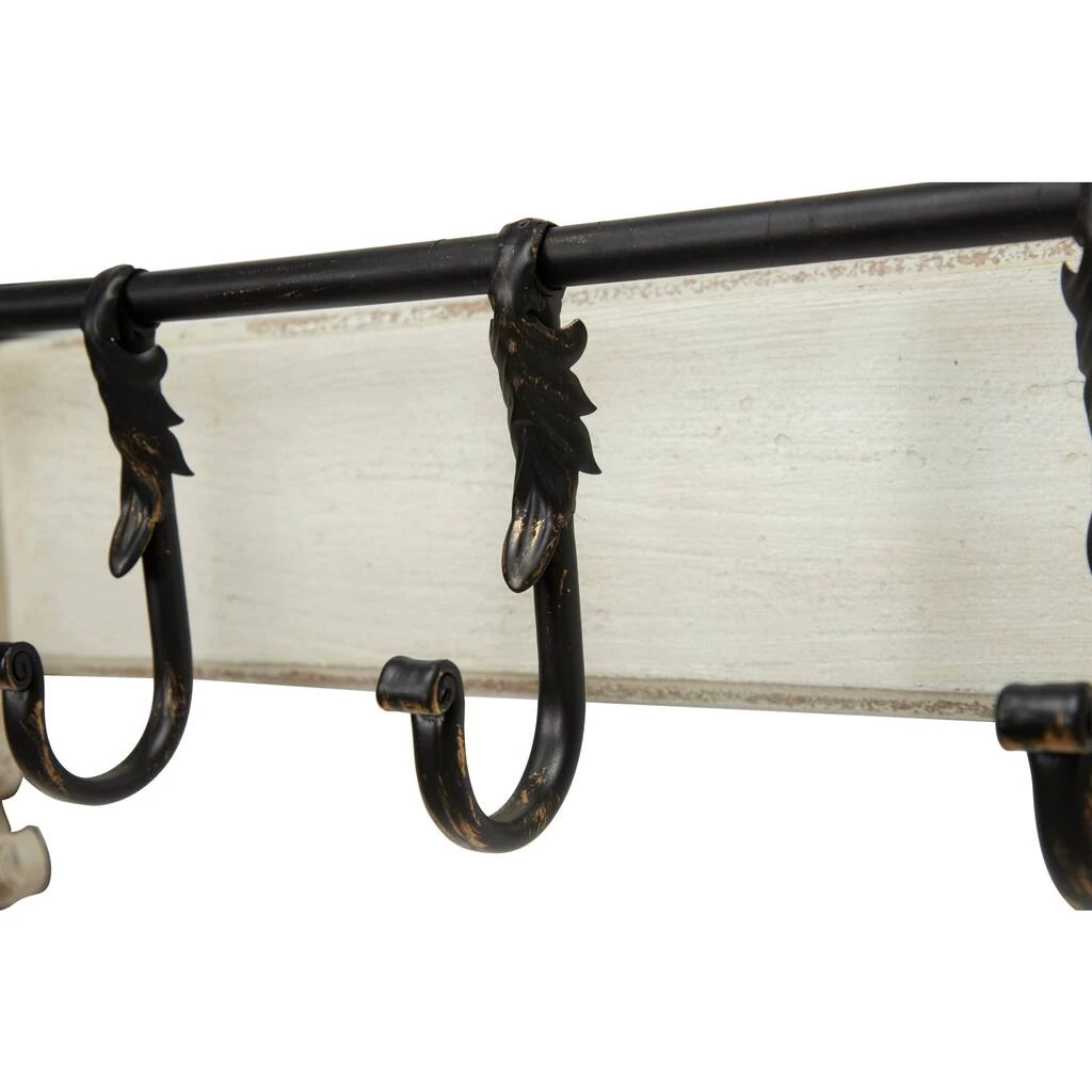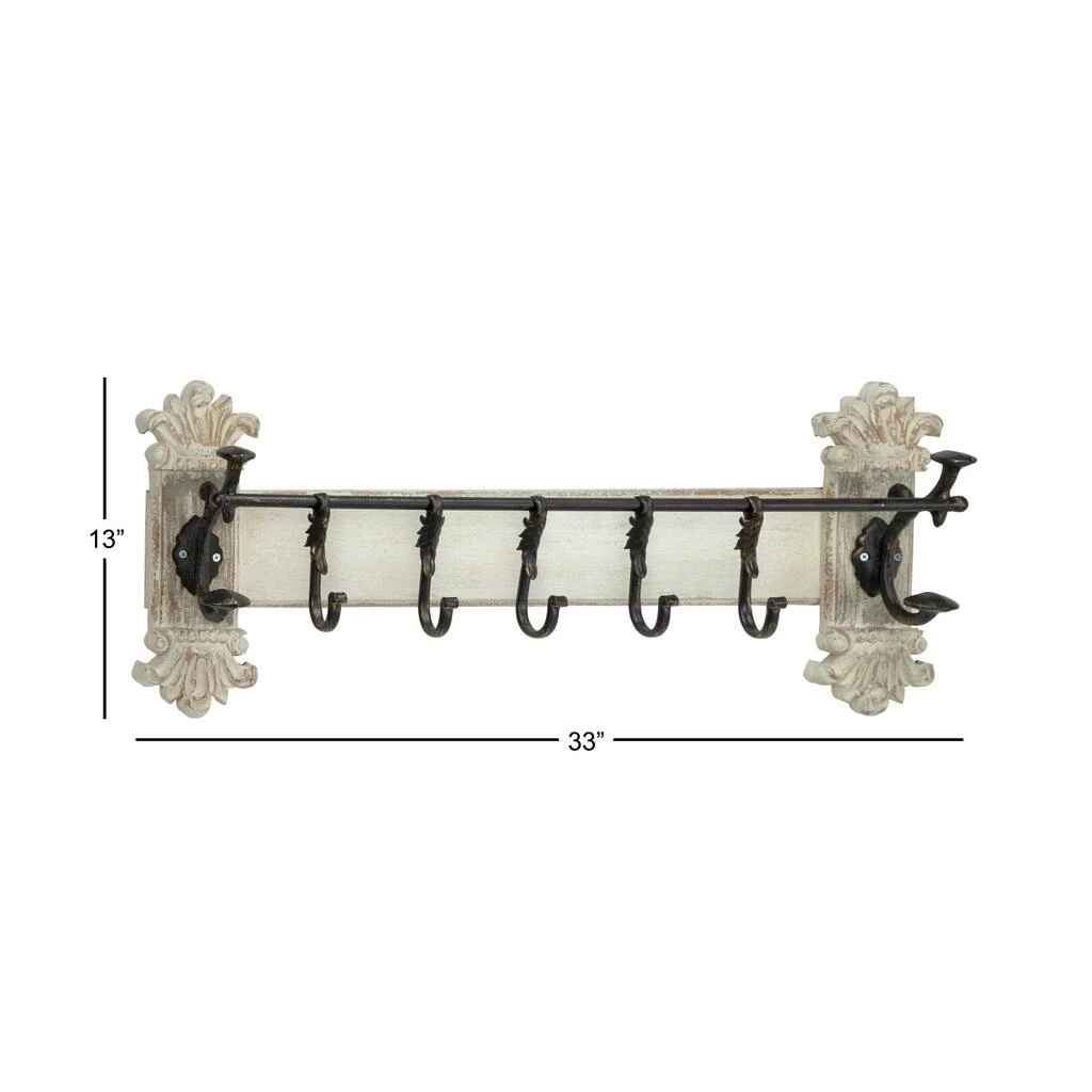 This antique-inspired wood wall rack features 7 iron hooks and carved acanthus accents. Whether you display wall decor or hang lightweight jackets, this vintage style accent decor makes a stunning entryway centerpiece with functionality. The distressed eggshell white finish is soft and neutral, suitable for vintage, French Country, and Country Cottage styled spaces, along with the decorative distressing for an antique feel. This item comes shipped in one carton. Easy to horizontally hang by sawtooth hardware in back; 7 metal hooks measure 5β each. Suitable for indoor use only. Each hook holds 5 to 8 lbs. Vintage inspired.