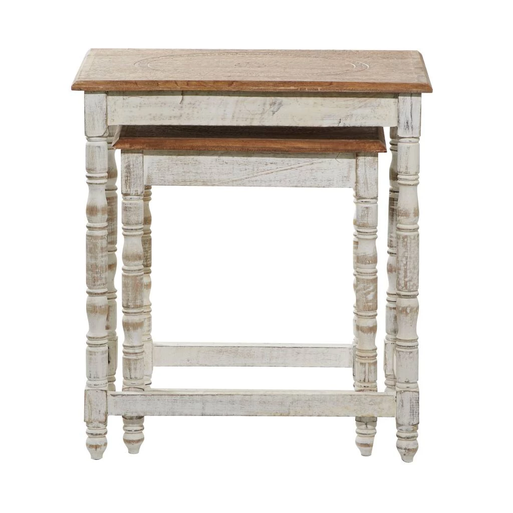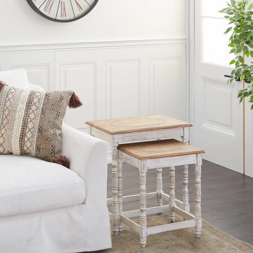 These nesting tables carry floral carvings on natural wood and a whitewashed distressing that both match well with farmhouse interiors. Use it as an accent piece in the living room, library, bedroom, waiting areas, or hallways of you home. A compact friendly table providing you with additional storage space any where in your home. This item comes shipped in one carton. Nesting tables can be used together or separate. Due to the handmade nature of this item, no two will be alike, there will be slight differences in shape, size, and color. Suitable for indoor use only. Made in India. These wood carved tables come as a set of 2βone large and one small. Farmhouse theme. Maximum weight limit is 100 lbs