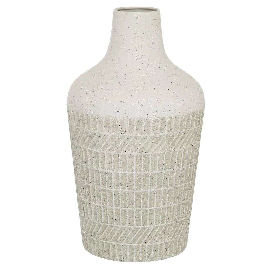 Boasting a stone-like texture, this large amphora vase features an eggshell white and black speckled finish, reminiscent of matte pottery glazes. This large vase, however, is solid iron, both lightweight and durable. The wide body is accented with deep vertical grooves adding more dynamic texture. The smooth top tapers up into a cylinder neck with no lip. This item ships in one carton. Suitable for indoor use only. Tapered neck table vase with medium rim opening. Contemporary design.