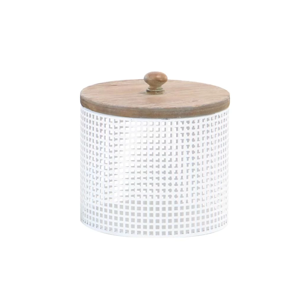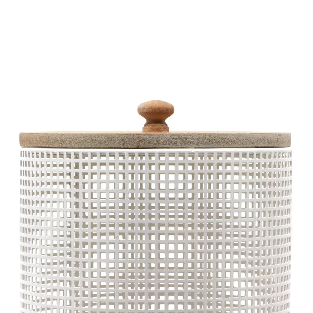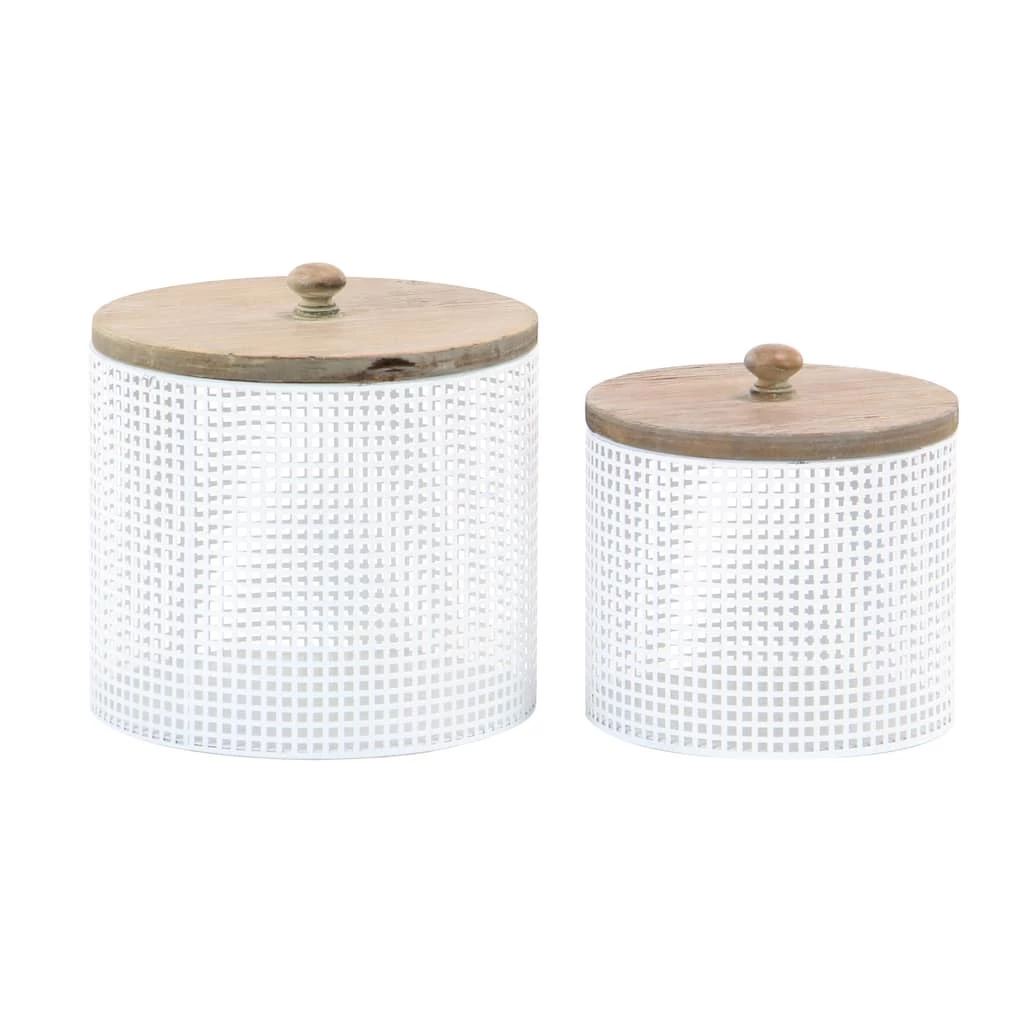 Add an extra touch of minimalistic breeze into your farmhouse-inspired home interior design with this set of 2, round white iron canisters with lid! Features a ‘cage-like’ see-through exterior in white matted finish, a flat base, and a natural brown wooden lid with finial knobs.