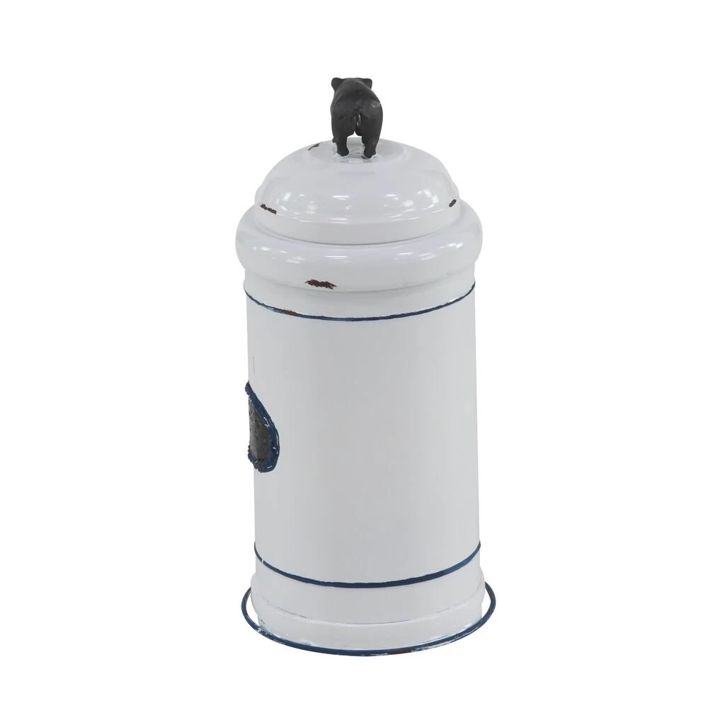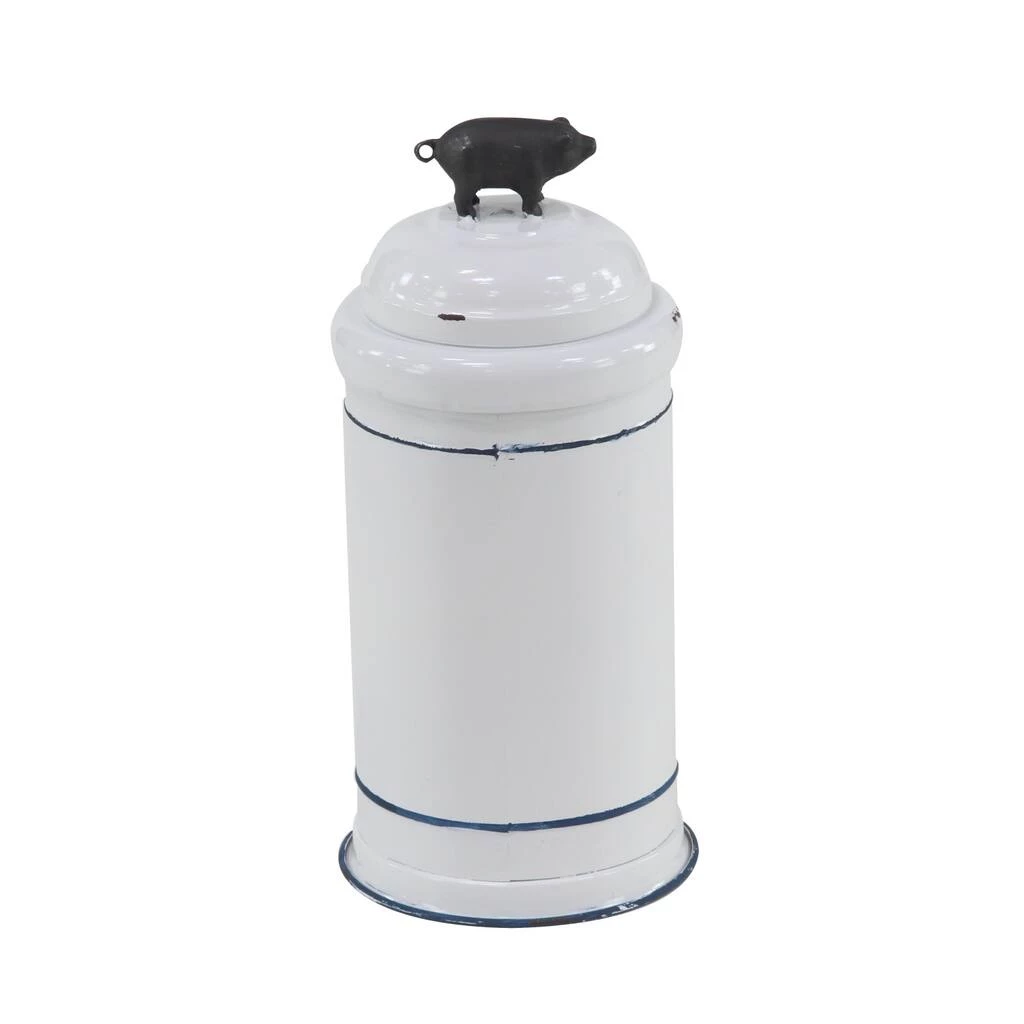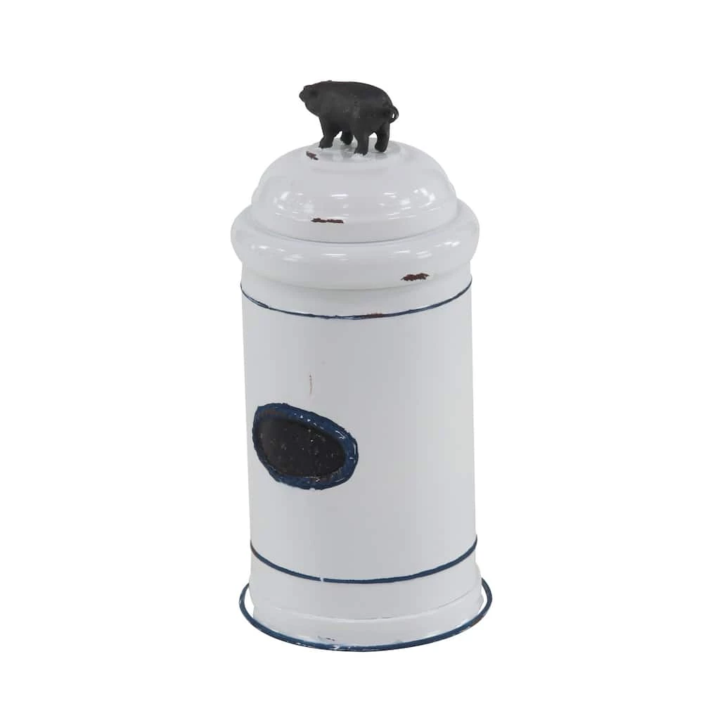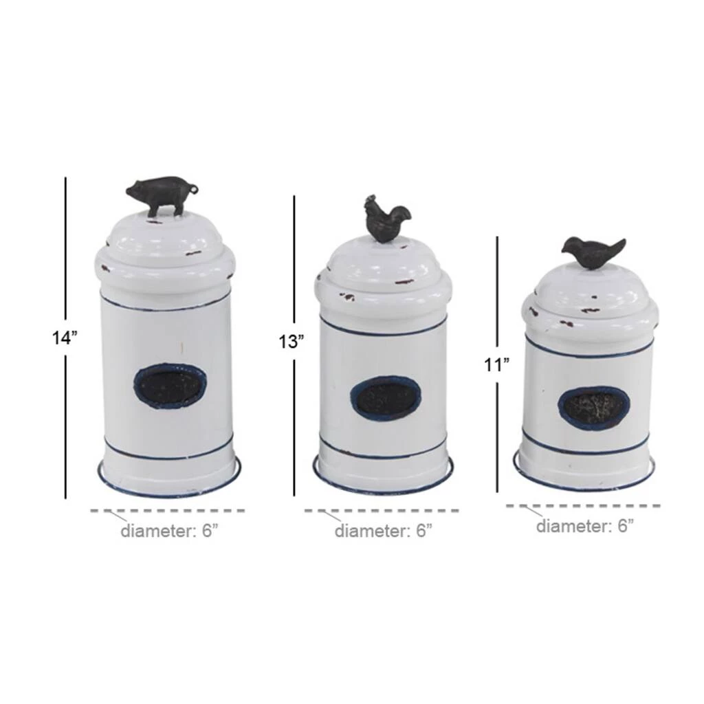 Farmhouse style and detail are apparent throughout this set of three large, round white metal jars. Black farm animal sculptures are perched at the lidsβ tops, including a pig, rooster, and bird with distressed decorative chipping throughout the glossy white paint, distressed blue trim, and blue and black dimensional escutcheons jutting out from the center of each jar. These jars will make the perfect home accent for your farmhouse style kitchen tabletop and shelf dΓ©cor.