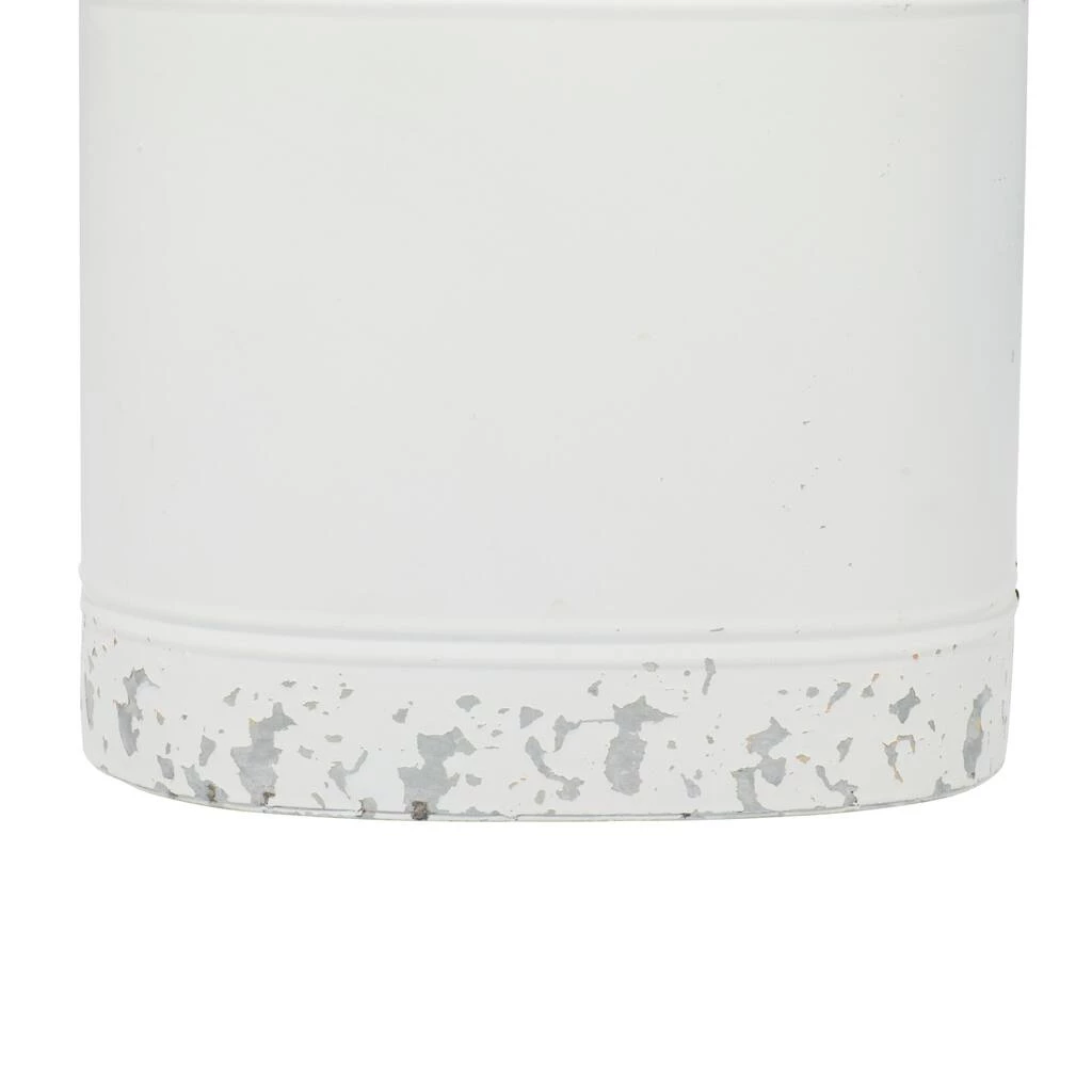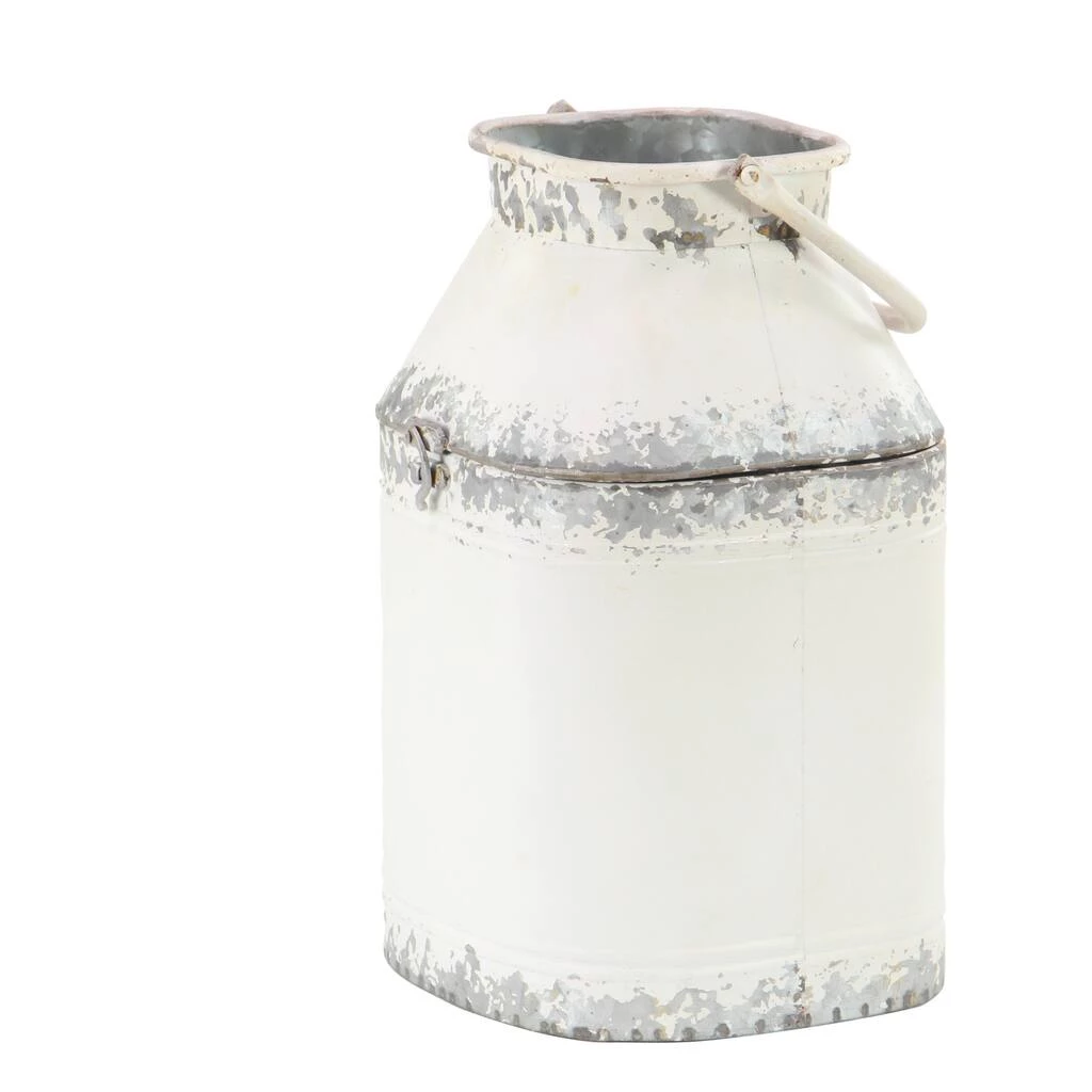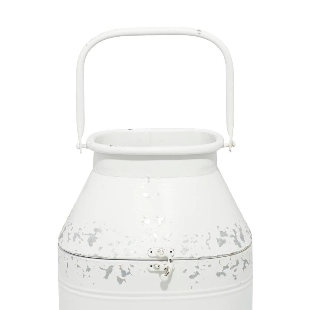 Take a trip down memory lane with these white decorative metal milk cans. Accented with white finish, these metal cans are sure to warm up your farmhouse-themed home. Each of these decorative canisters feature conveniently placed single metal handles. Its neutral white distressed finish easily compliments a vintage palate and is a wonderful piece to any rustic or farmhouse-inspired home. Displayed solo or with other similar themed décor for some nostalgic reminiscing, this set of two metal milk cans go well as cozy tabletop centerpieces or vases. Designed with black rubber stoppers at the base that prevent scratching furniture and table tops, as well as sliding around.