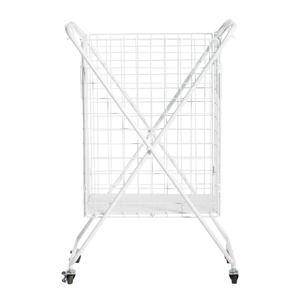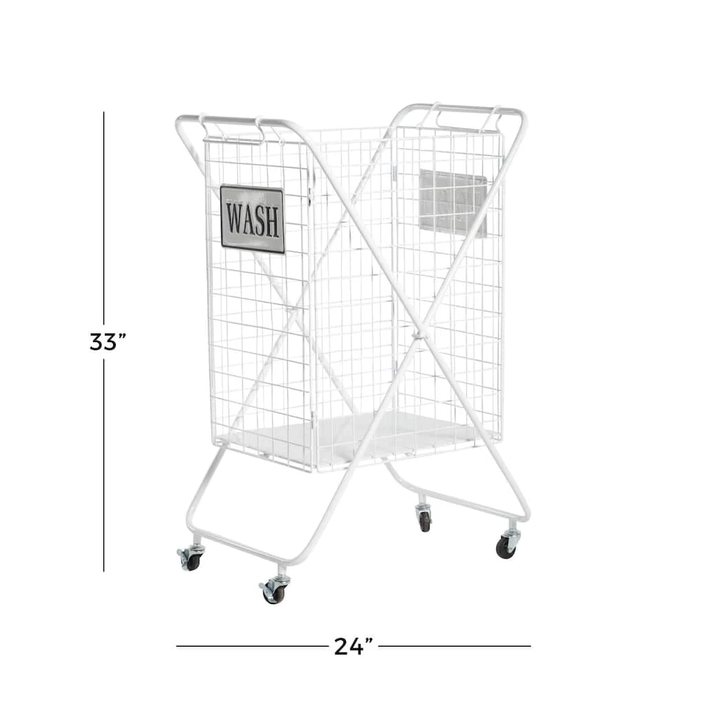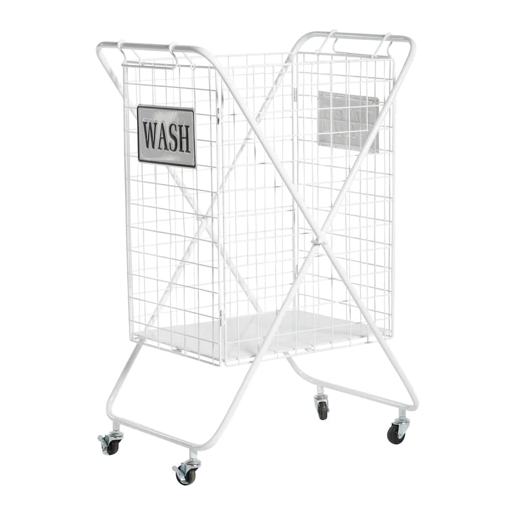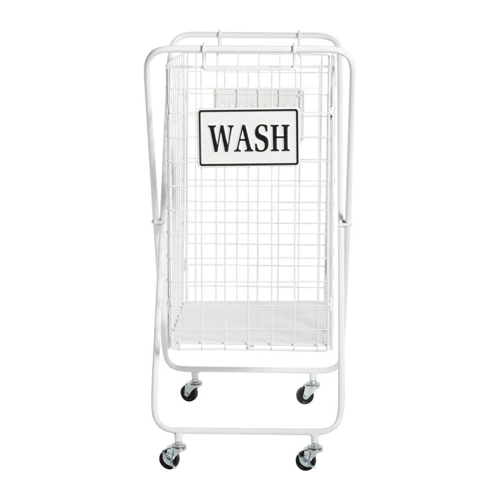 Add a farmhouse style to your home organization with this large white metal rolling laundry hamper, featuring black and white metal βWASHβ signs on each side. Rounded metal handles across the top allow for easy push/pull movement in addition to the 360-degree rolling caster wheels for a smooth glide. The neutral white color is bright and clean and will work with any color palette.