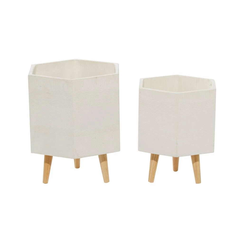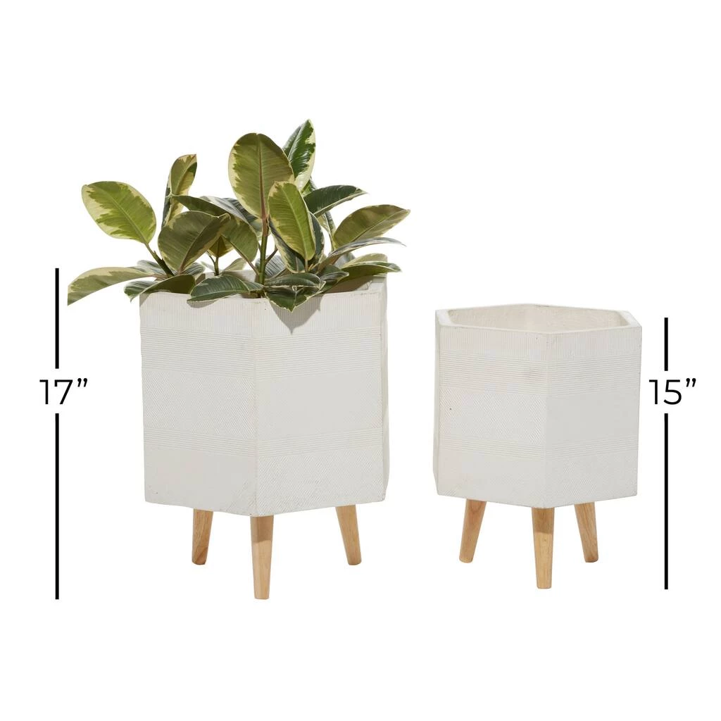 Leverage on the variation in pot size and depth and height of this 2-in-1 set of hexagon indoor planters for contemporary or modern interior designing. The simplicity of the exteriors can match with dim color palettes, muted patterns, and less tactile textures. Wooden stands and no-drainage hole white pots make up the solid construction to not disturb the calmness in a corner of your living space. Use as plant holders or corner accent pieces in modern or contemporary interiors.Β