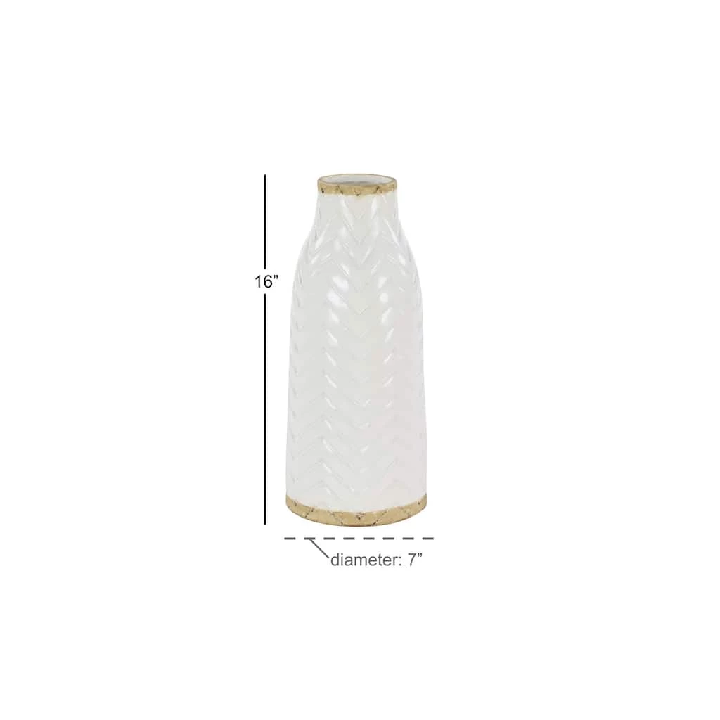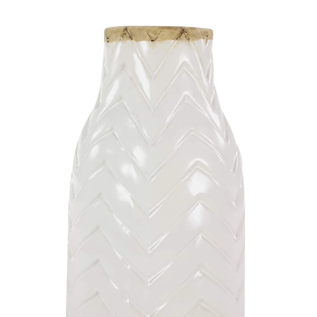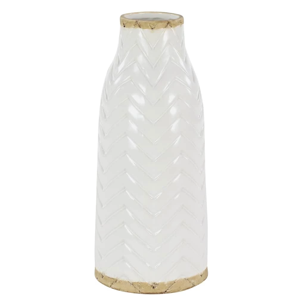 Enrich your coastal or modern space with some subtle movement from this 7″ x 16β round, white ceramic vase, featuring a carved chevron pattern with a white glaze finish. This decorative vase also has a ΒΎ inch hand-painted, matte light brown stripe at the top and the base, creating a cork look finish. The entire interior is also finished in the semi-glossy, opaque white glaze. This item ships in one carton. Suitable for indoor use only. Tapered cylinder vase with medium-sized rim opening. Coastal design.