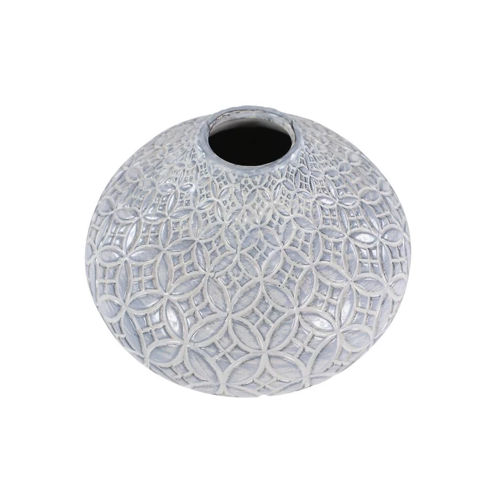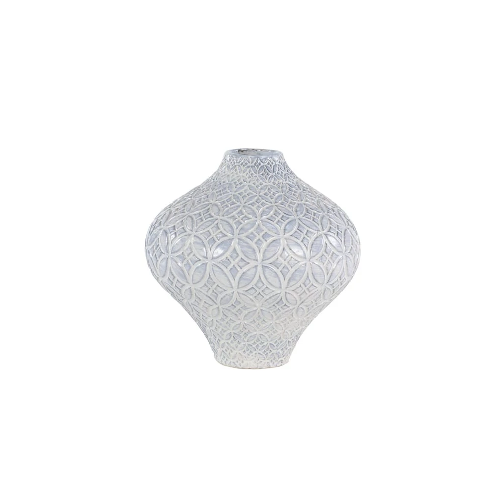 Full of coastal inspired character, this large ceramic vase boasts a high-gloss white glaze base color with a dusty, light blue crosshatch texture over the decorative diamond and circular shaped pattern throughout the body. The tapered base of this decorative vase rounds out in the center, further accentuating the robust relief pattern and texture, then tapers in again to a small mouth with no lip. This item ships in one carton. Suitable for indoor use only. Novelty urn bud vase with narrow opening. Coastal design.