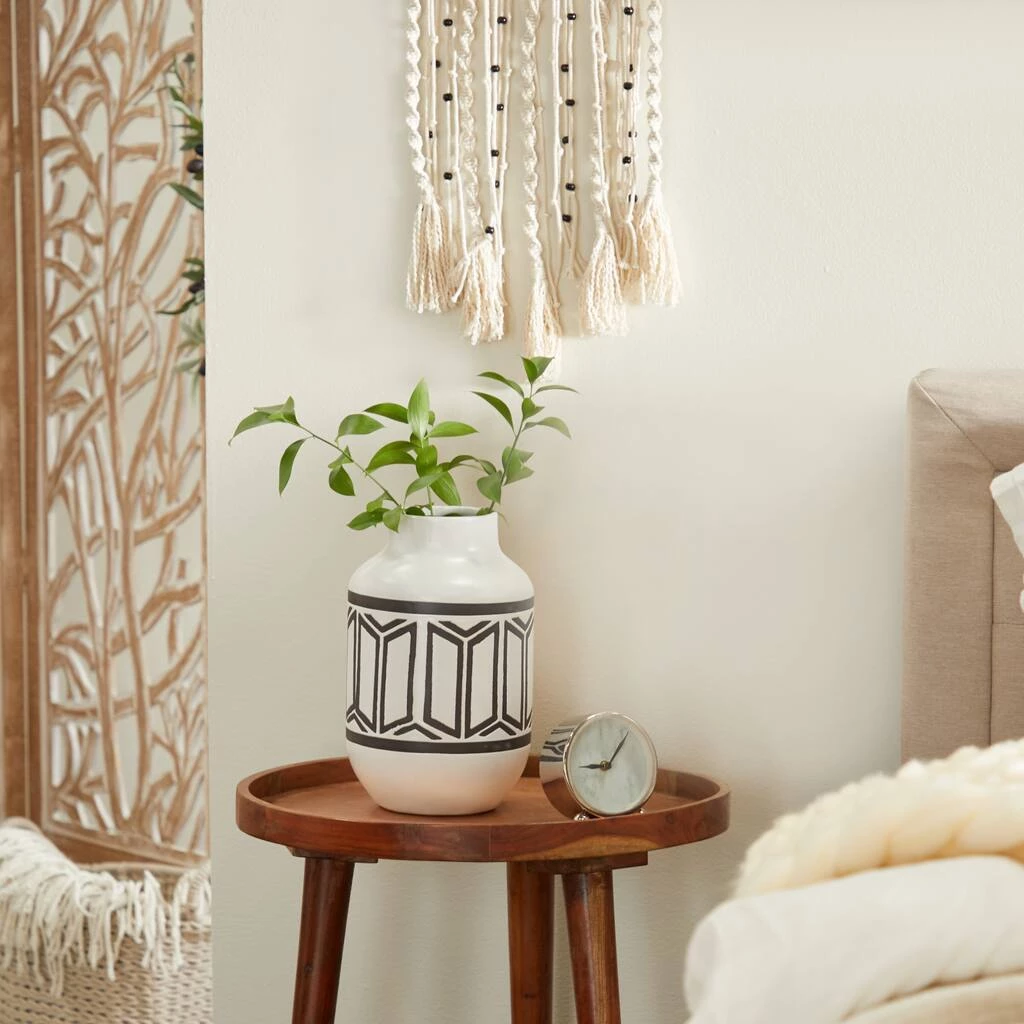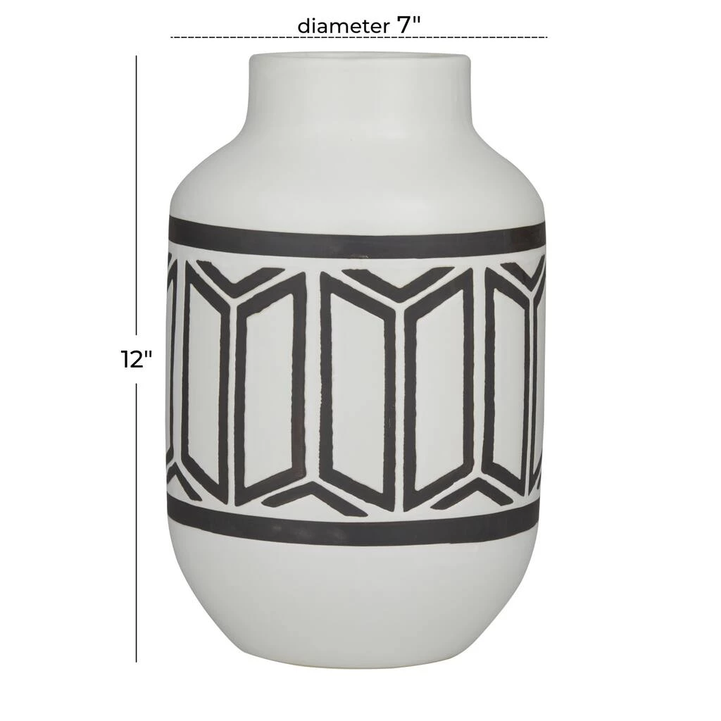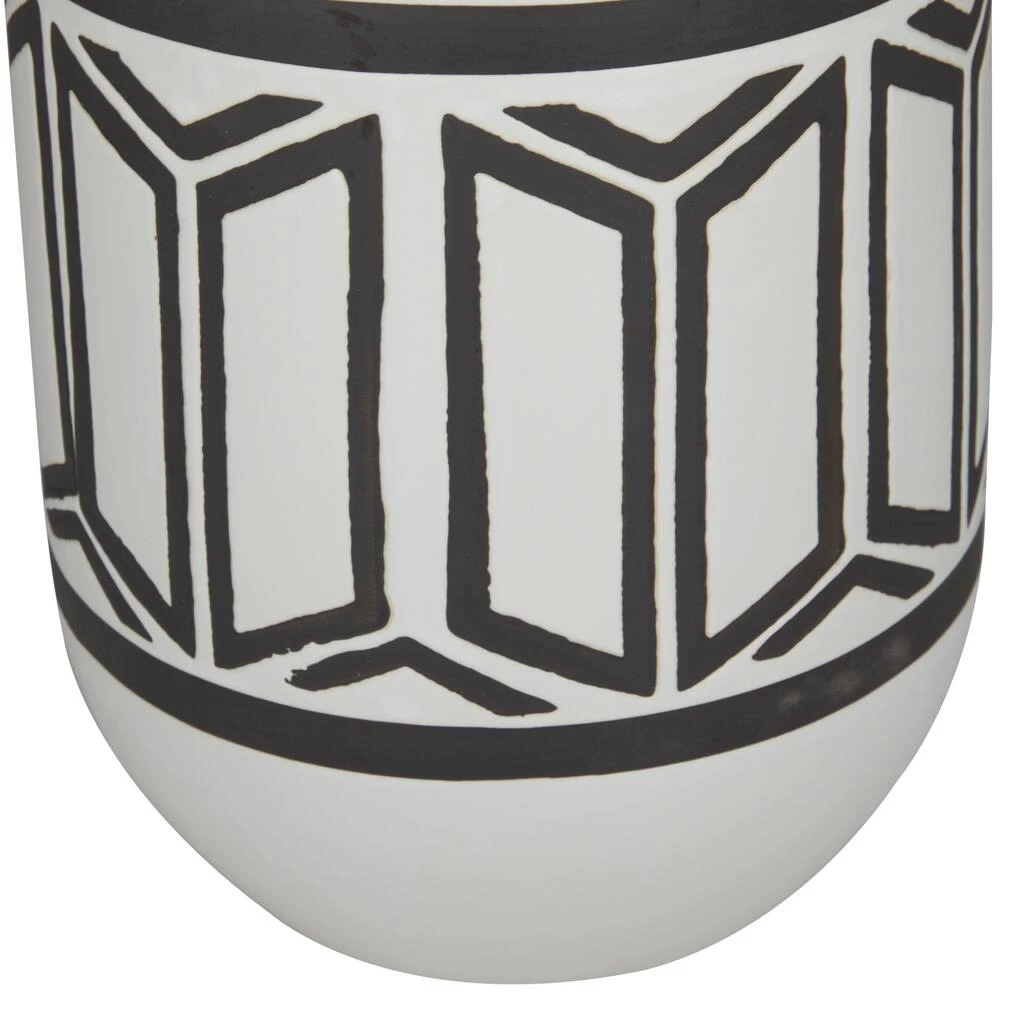 Create a boho-inspired focal point vase piece with this black and white porcelain vase and style it up with short stem floral arrangements on neutral colored walls and furniture pieces. This vase is perfect for displaying orbs filler and twigs, as well as filling up any negative space against an open surface space. Create depth and form onto your space by displaying this beautifully crafted vase. This item comes shipped in one carton. Suitable for indoor use. Transitional style. Vase has a 5″D opening .