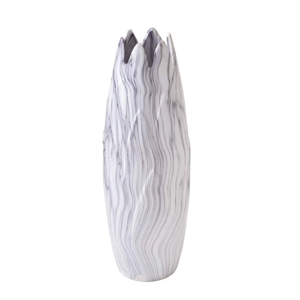 Add a creative touch of modern-inspired shapes into your artistic, contemporary, and minimalist living spaces with this splendidly smooth white and gray marbled vase! This light and elegant home dΓ©cor showcases a fun, cracked ‘Dino Egg’ inspired ceramic vase design and a flat round base made of stoneware material. Their classy and opulent white-tone makes them ideal for both light and dark-hued interiors/furniture and are stunning focal point for coffee tables, desks, dining areas, study rooms, meeting rooms, and executive offices. Designed with black rubber stoppers at the base that prevent scratching furniture and table tops, as well as sliding around.