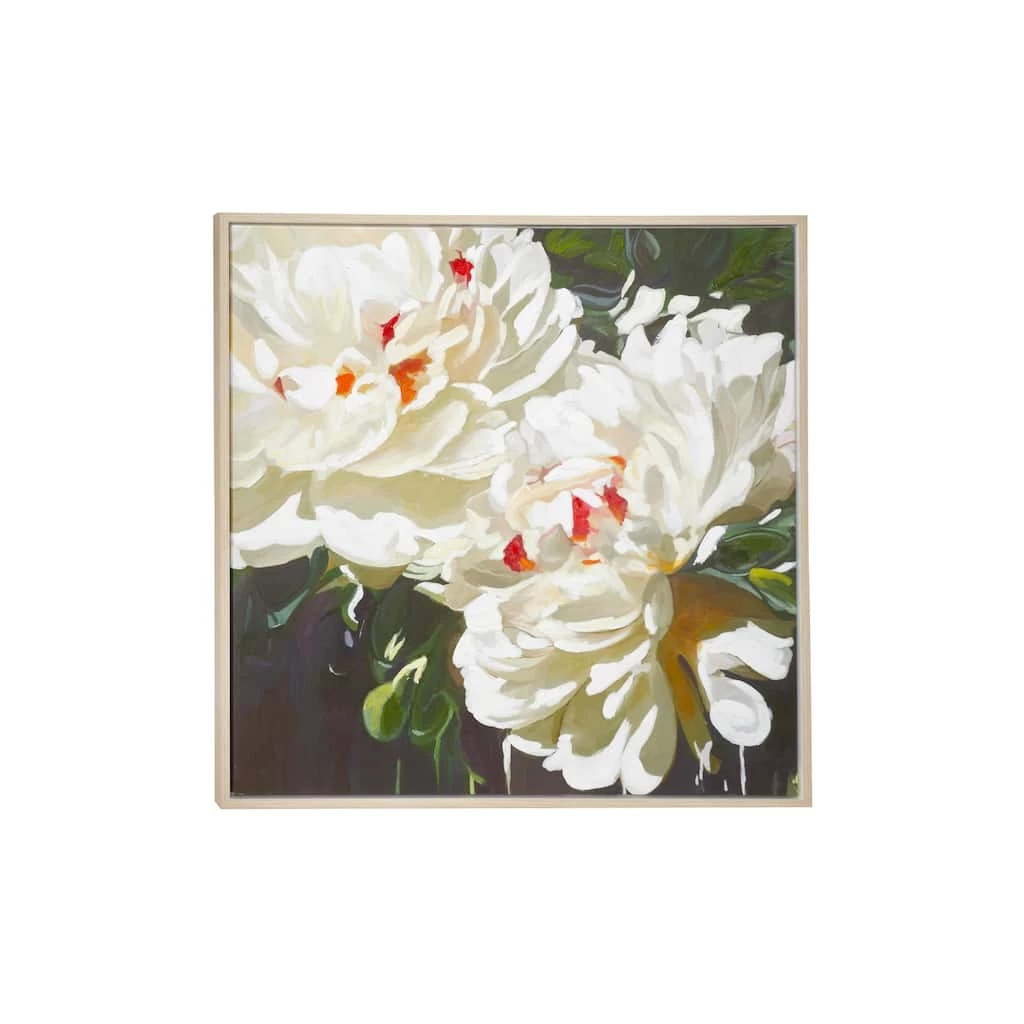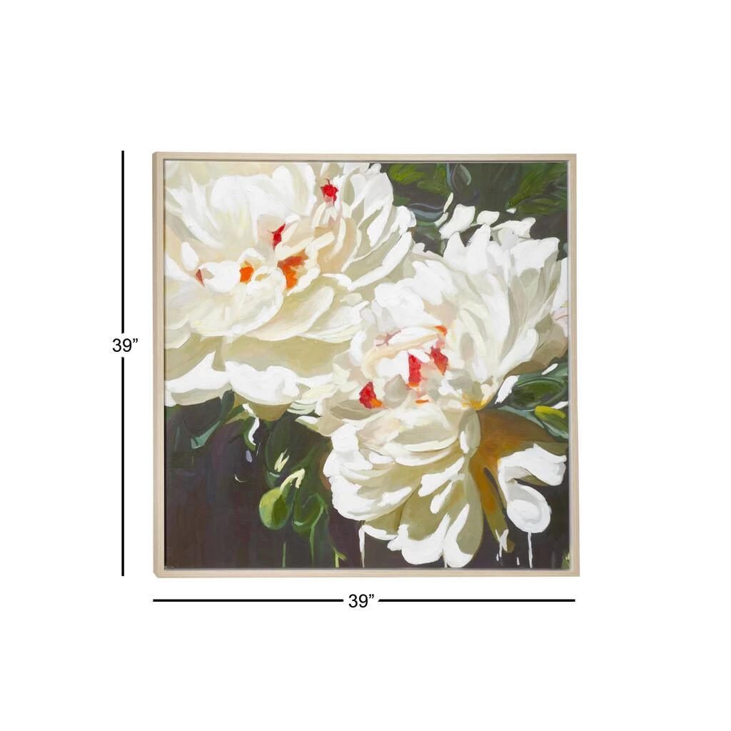 Big and bold, this large acrylic painting of white flowers makes a dynamic addition to your traditional or botanical-themed decor. The full, smooth white brush strokes form the petals of the white flowers with beige and tan shadows to show definition, all juxtaposed by small dollops of poppy red and orange paint that fill in the center of each flower. Large, sweeping leaves in light and dark green with some grayish-blue strokes fill out the background, wrapping around the bright white flowers. A sawtooth hardware is placed at the back section for easy hanging via nail or screw. Suitable for indoor use only. This item comes shipped in one carton.