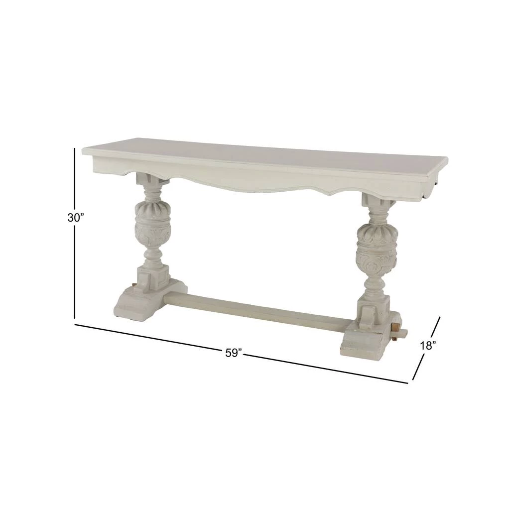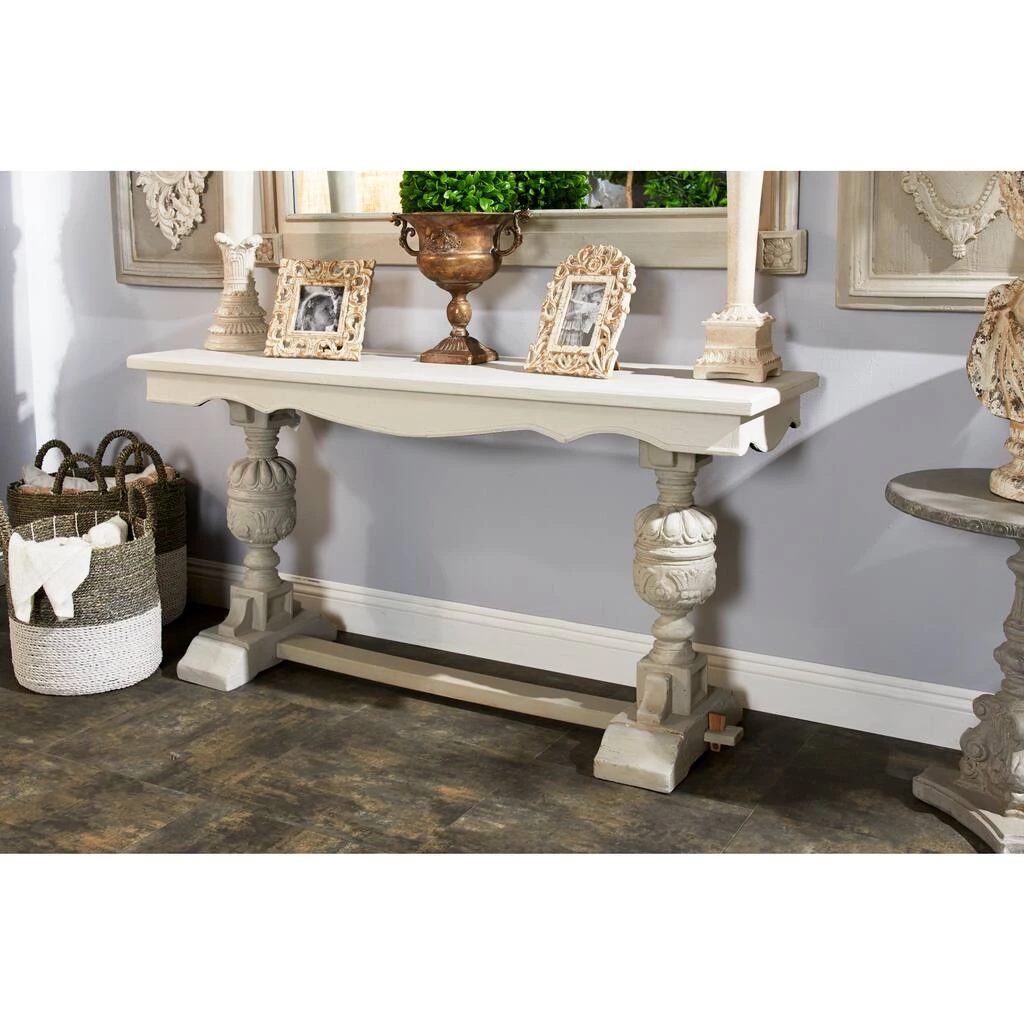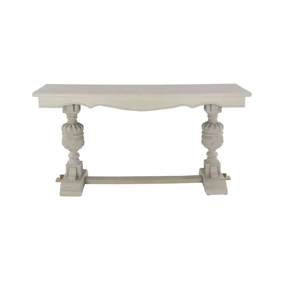 This wood tableβs soft, off-white and gray colors, speckled texture, and ornately carved columns bring the romantic, antique look of the French countryside into your home.Useful and elegant, console tables are more than just a place to throw your mail. Use it as an accent piece in the living room, library, bedroom, waiting areas, or hallways of you home. This item comes shipped in one carton. Carved lip, turned pedestal base columns. Suitable for indoor use only. Some assembly required. This accent furniture can support up to 100 lbs. Traditional theme