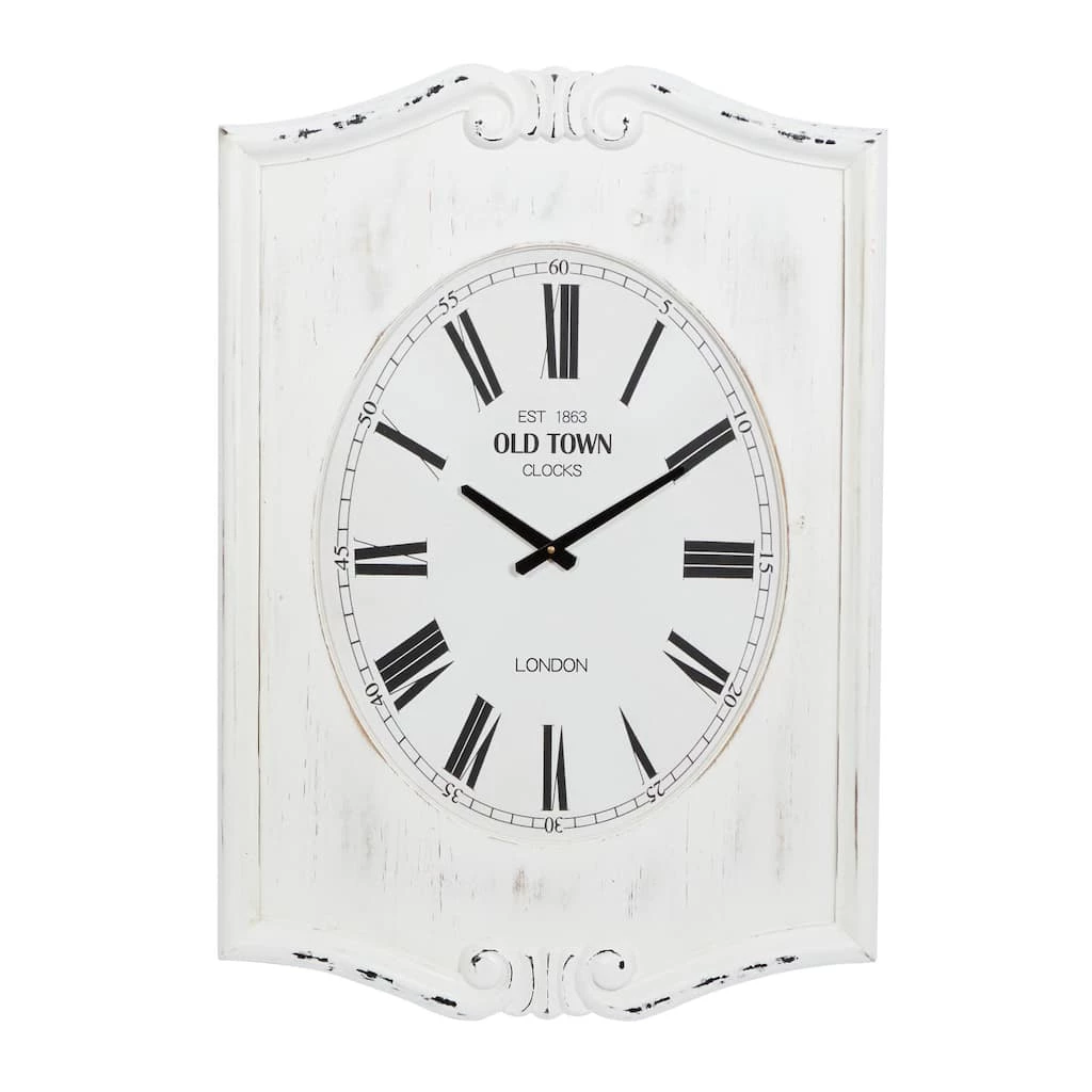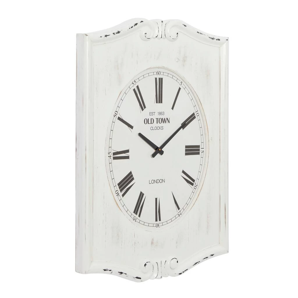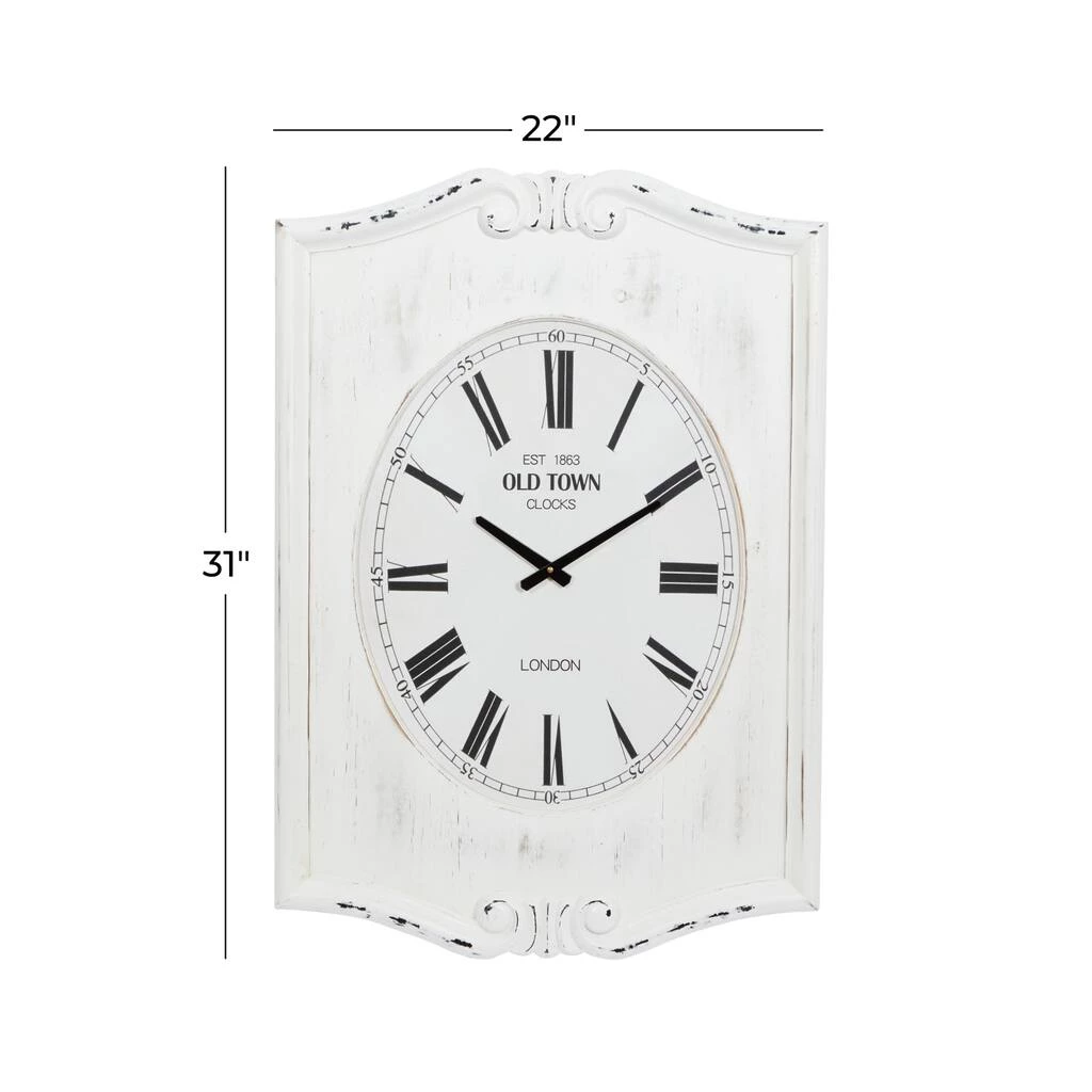 Stick with the classics and never regret your choices ever again. This traditional style white wood old town wall clock will bring you back in time to experience what tradition truly feels and looks like. This wooden clock features an elegant concept for the hour and minute markers with Roman numerals for the hours with a thin stroke accent, and a combination of Arabic and bars for the minute markers. The distressed white finish of this wall clock stands out as it complements with the black clock hands and time markers. This wall clock will make heads turn towards any wall in your vintage or traditional inspired home with the elegant, classy, and timeless vibes it carries with it. Runs on one AA battery (not included). This item ships in one carton. Roman numerals for the hour markers. The clock mechanism runs silent. Easily hanging using hanging hardware on the back. Suitable for indoor use only. Farmhouse-themed style.